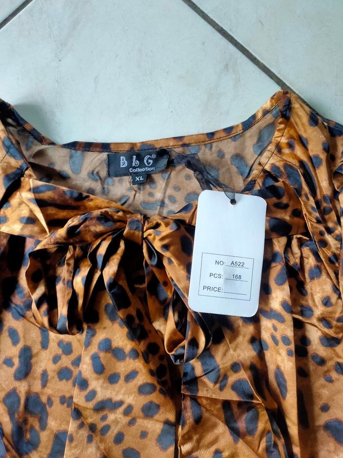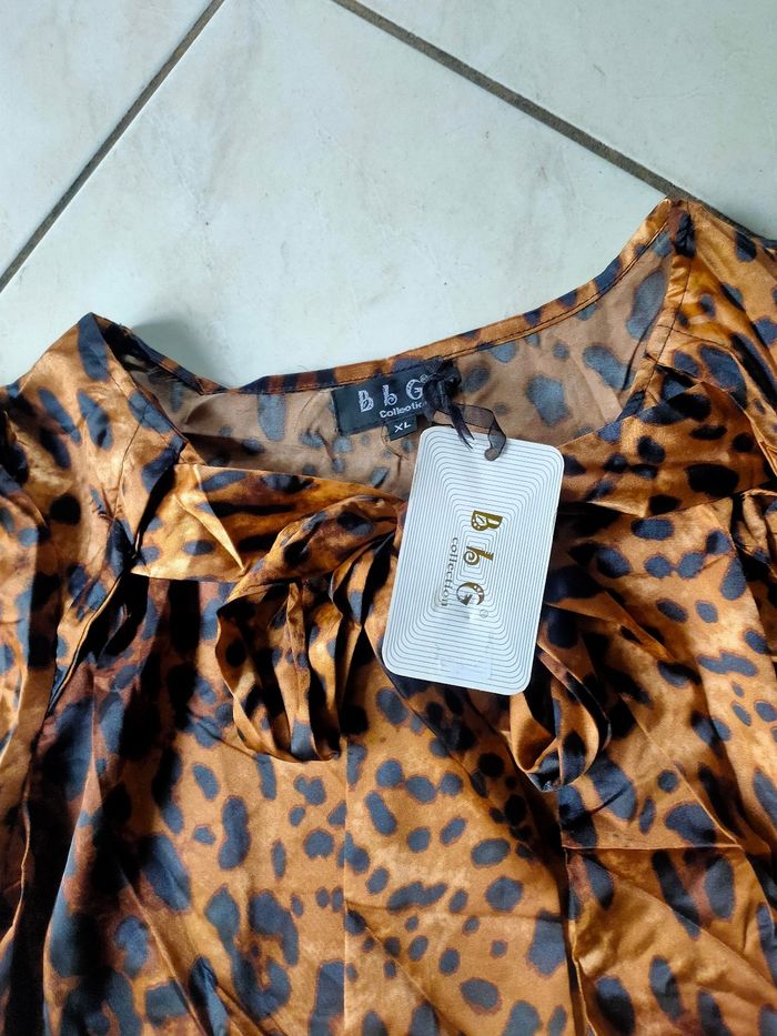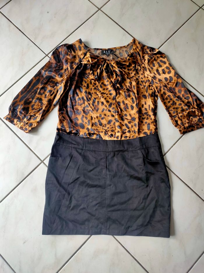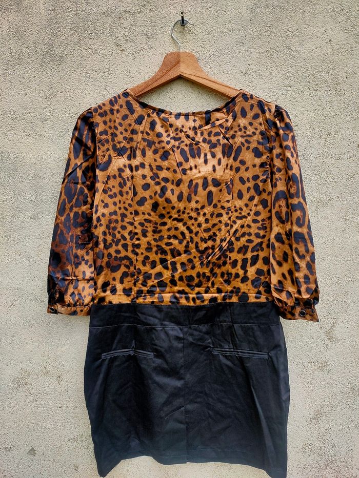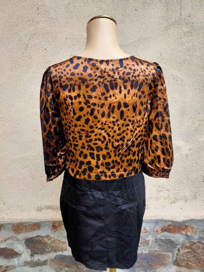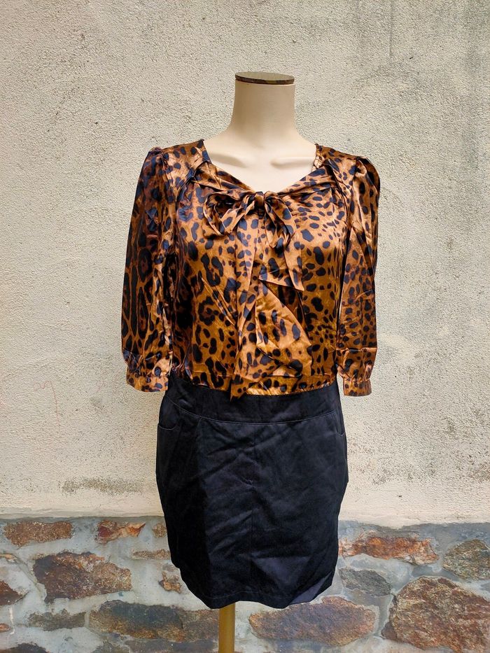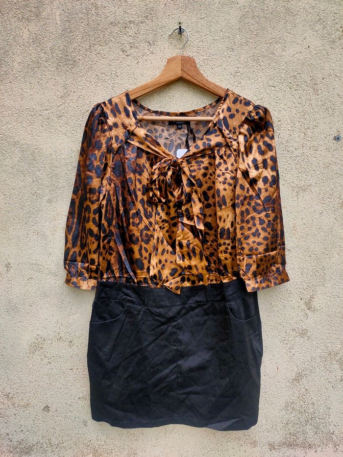 Jolie robe motifs léopard, tissu satiné pour la partie haute, lien a nouer devant au décolleté, fermeture éclair invisible sur le côté pour faciliter l'enfilage. Elle est neuve avec étiquette, n'a jamais été porté.