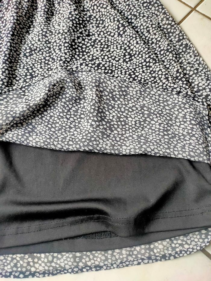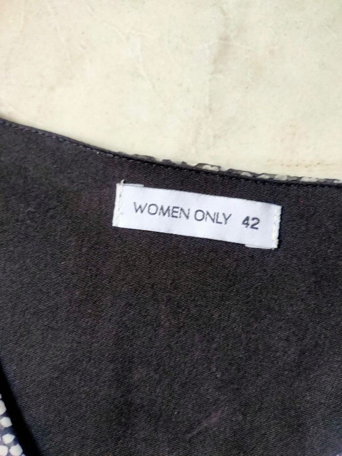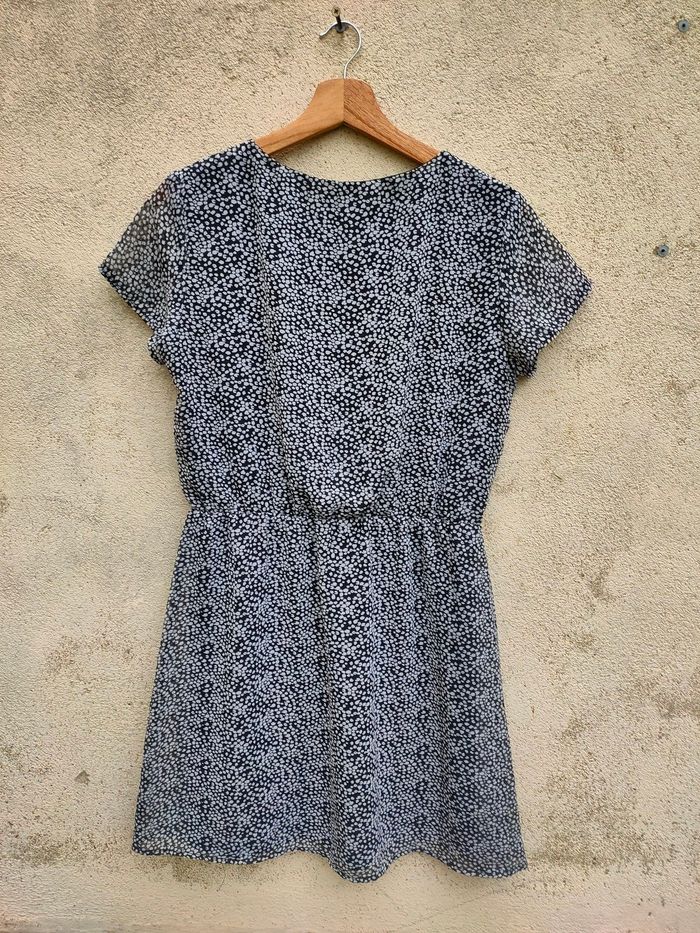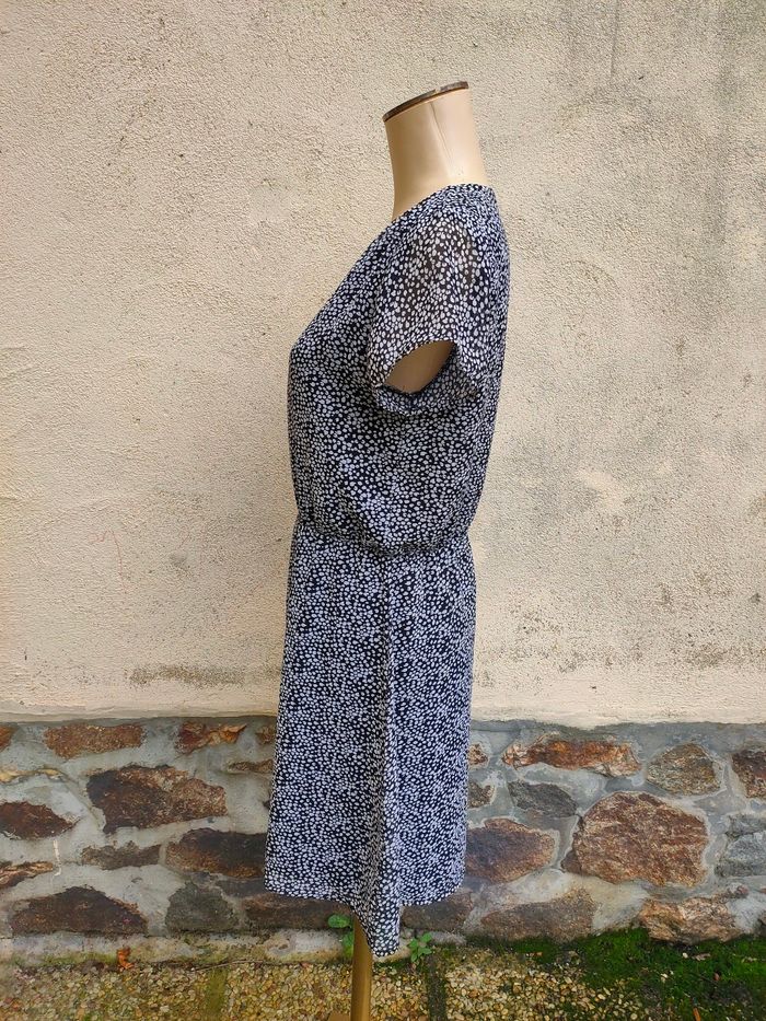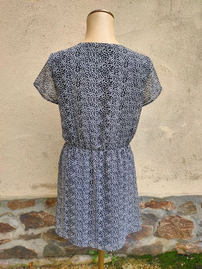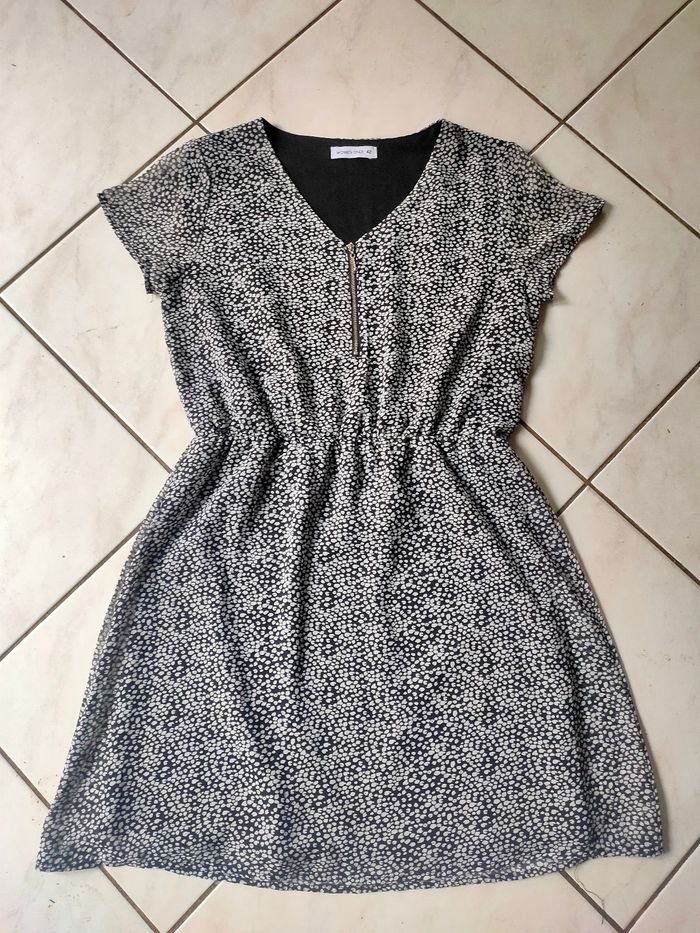Robe fluide coloris noir et blanche, entièrement doublé. Col V, décolleté avec fermeture éclair, manches courtes, ceinture élastique a la taille, entièrement doublé. Marque Women Only, taille 42. Elle est en excellent état.