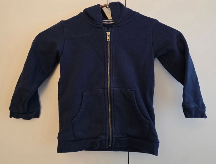 Sweat zippé de marque Marks & Spencer, avec capuche, taille 24 mois, 85% coton, 15% polyester. Couleur bleu foncé, 2 poches.