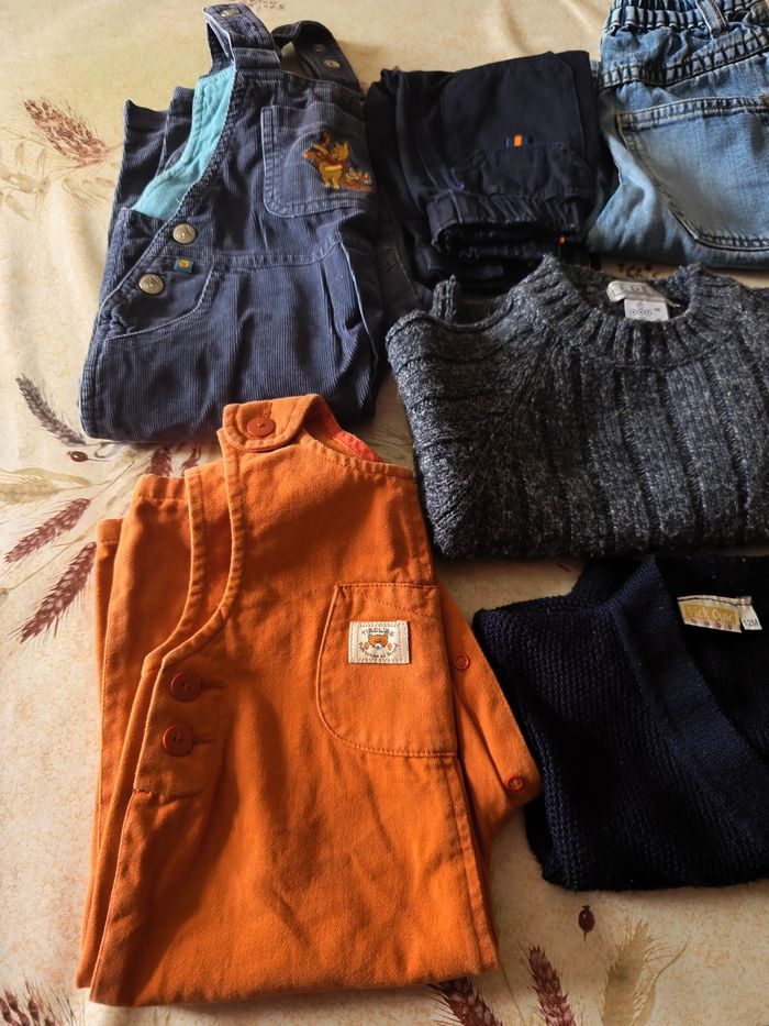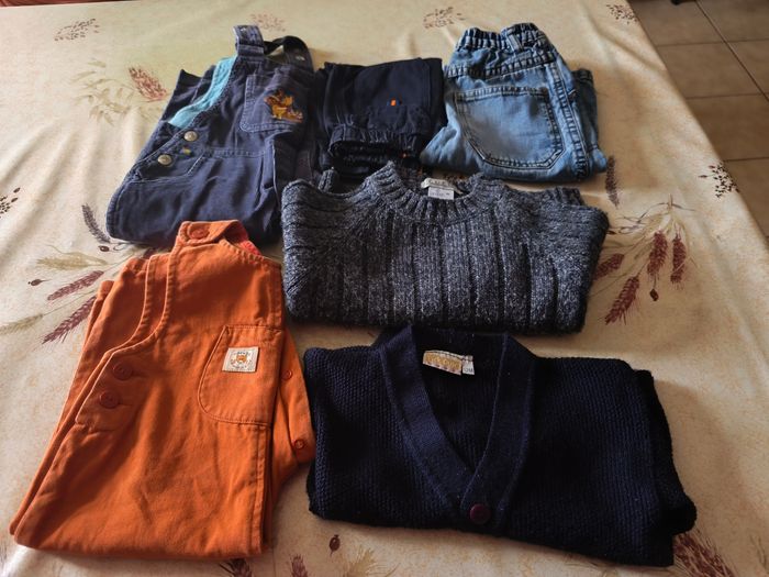 Vend lot de vêtements garçon Taille 9/12 mois 2 salopettes 2 pantalons 1 pull 1 veste Soit 6 articles Differentes marques Bon état général 6€