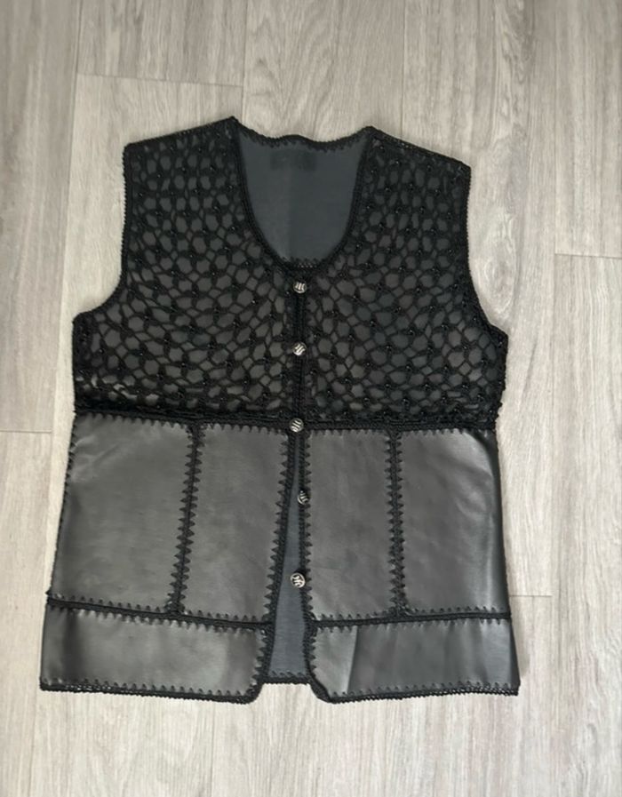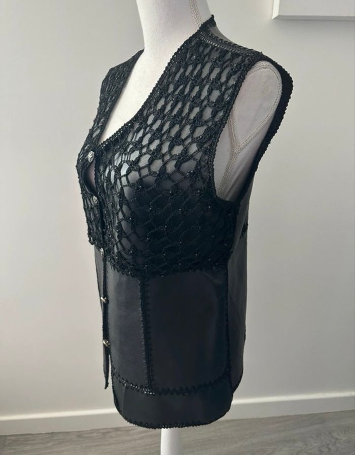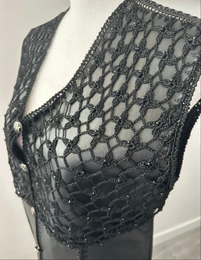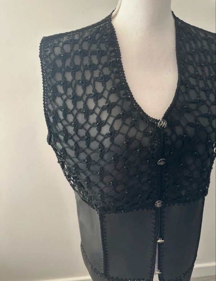 Cardigan boléro sans manche - Excellent état - Taille 40 équivalent L Dimensions en bas de l'annonce - Couleur noire - Vintage, années 80' - En cuir véritable - Empiècements patchwork - Se ferme avec des boutons - Maille ajourée et petites perles - Pas d'étiquette de taille ni de matière Dimensions: - 52cm niveau aisselles - 66cm de long