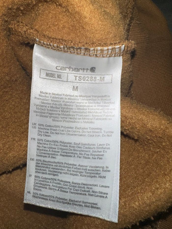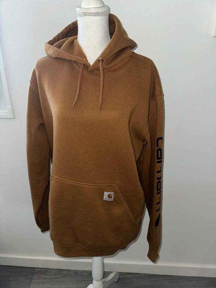 Sweatshirt - Excellent état - Taille M modèle homme Dimensions en bas de l’annonce - Coupe loose fit - Fabriqué au Mexique - Camel marron et noir - Avec capuche - Poche kangourou ventrale - Intérieur polaire - Logo Carhartt sur le bras - Logo brodé sur la poche ventrale - Coton et polyester Dimensions: - 54cm niveau épaules - 62cm niveau aisselles - 77cm de long - 67/57 manches