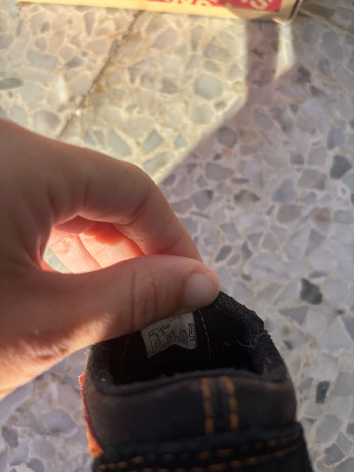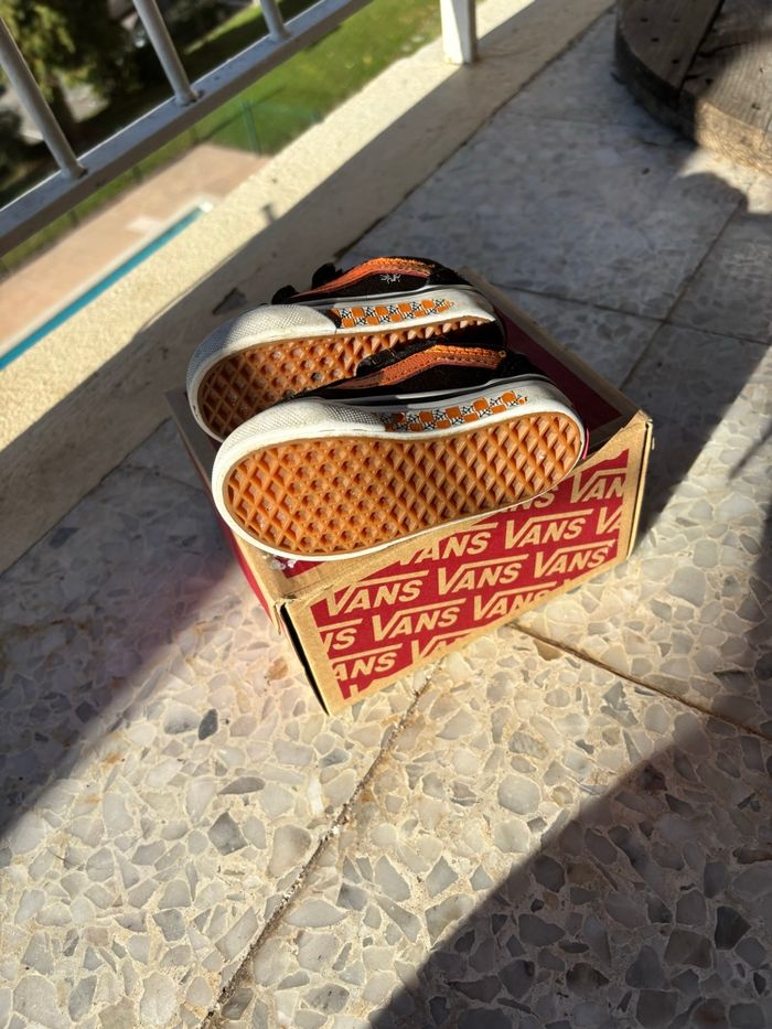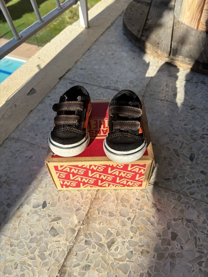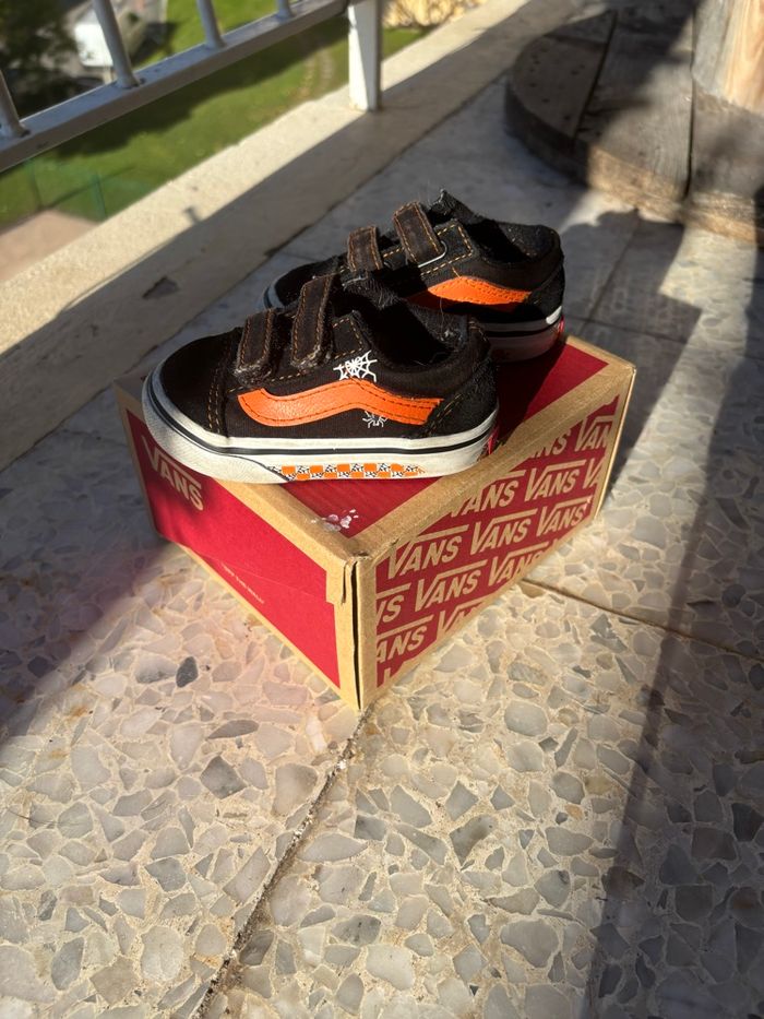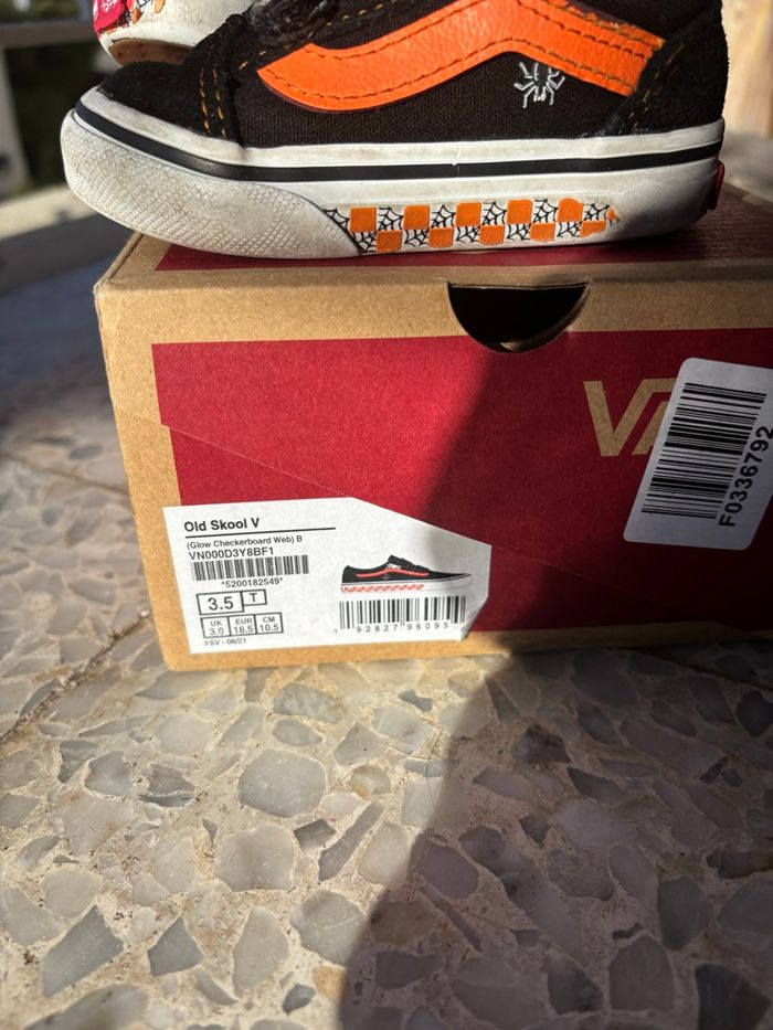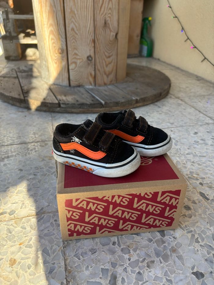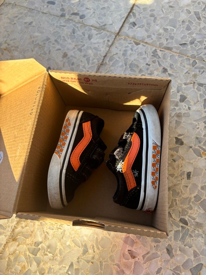 ns old skool V orange noir Taille 18.5 En super état Old school Portées mais bien entretenu Petit détail toile d’araignée super sympa Très confortable pour un bébé qui apprend à marcher Baskets à scratch Entre la taille 18 et la taille 19