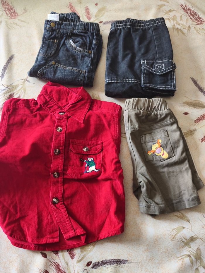 Vend lot de vêtements bébé garçon 12 mois 1, chemise manches longues 2 pantalons 1 short Soit 4 vêtements Très bon état général Differentes marques 5€