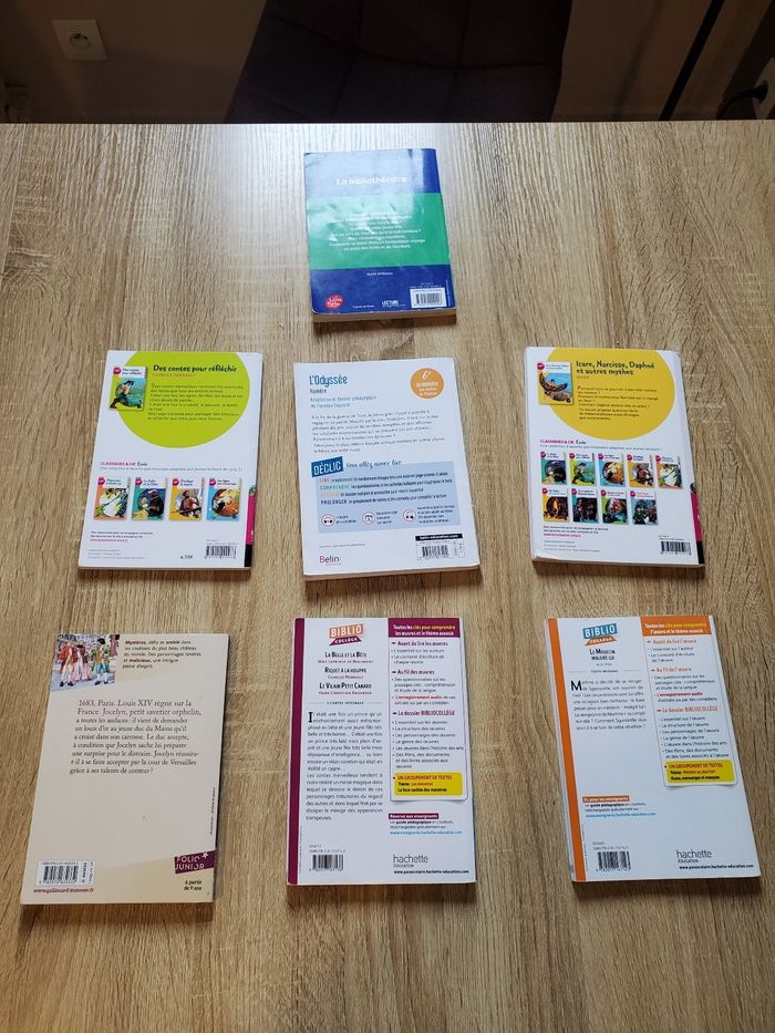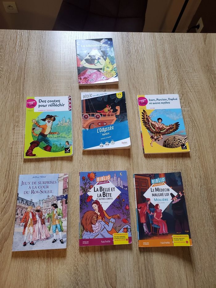 Lot de 7 livres étudiés en 6eme la bibliothécaire Des contes pour réfléchir L odyssée d homere Icare,narcisse, daphné et autres mythes Jeux de surprise à la cour du roi soleil La belle et la bête et autres contes. Le médecin malgré lui.