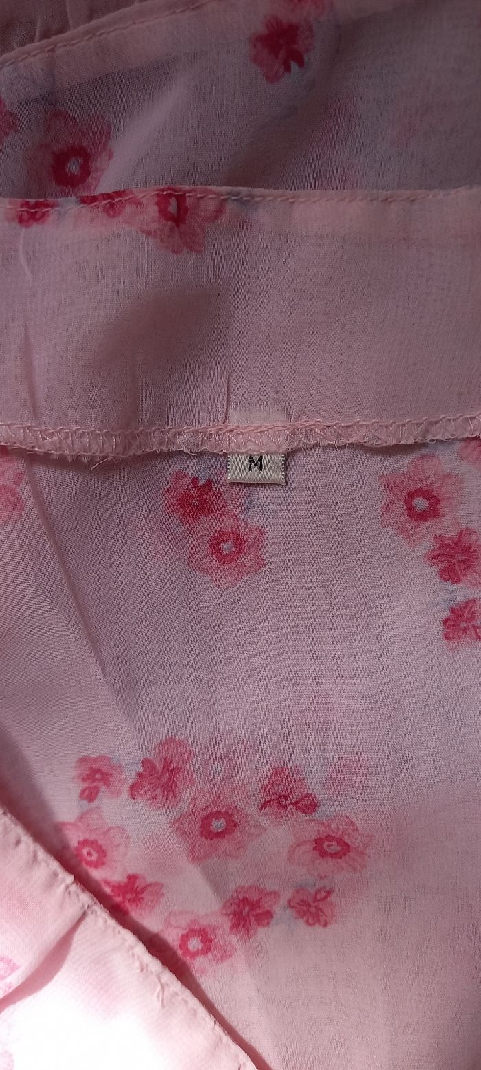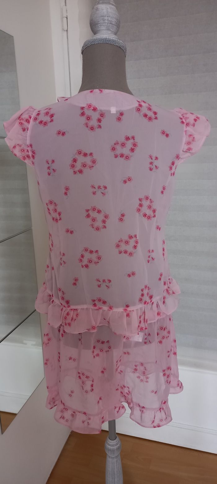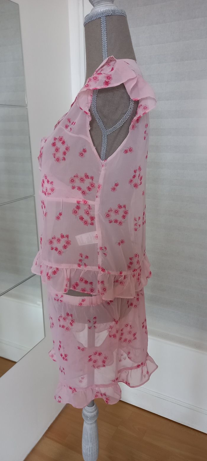Ensemble nuit rose de taille M matière polyester, haut croisé volanté ainsi que les manches et le bas. Sa longueur est de 53cm, largeur de aisselle à aisselle 47cm.