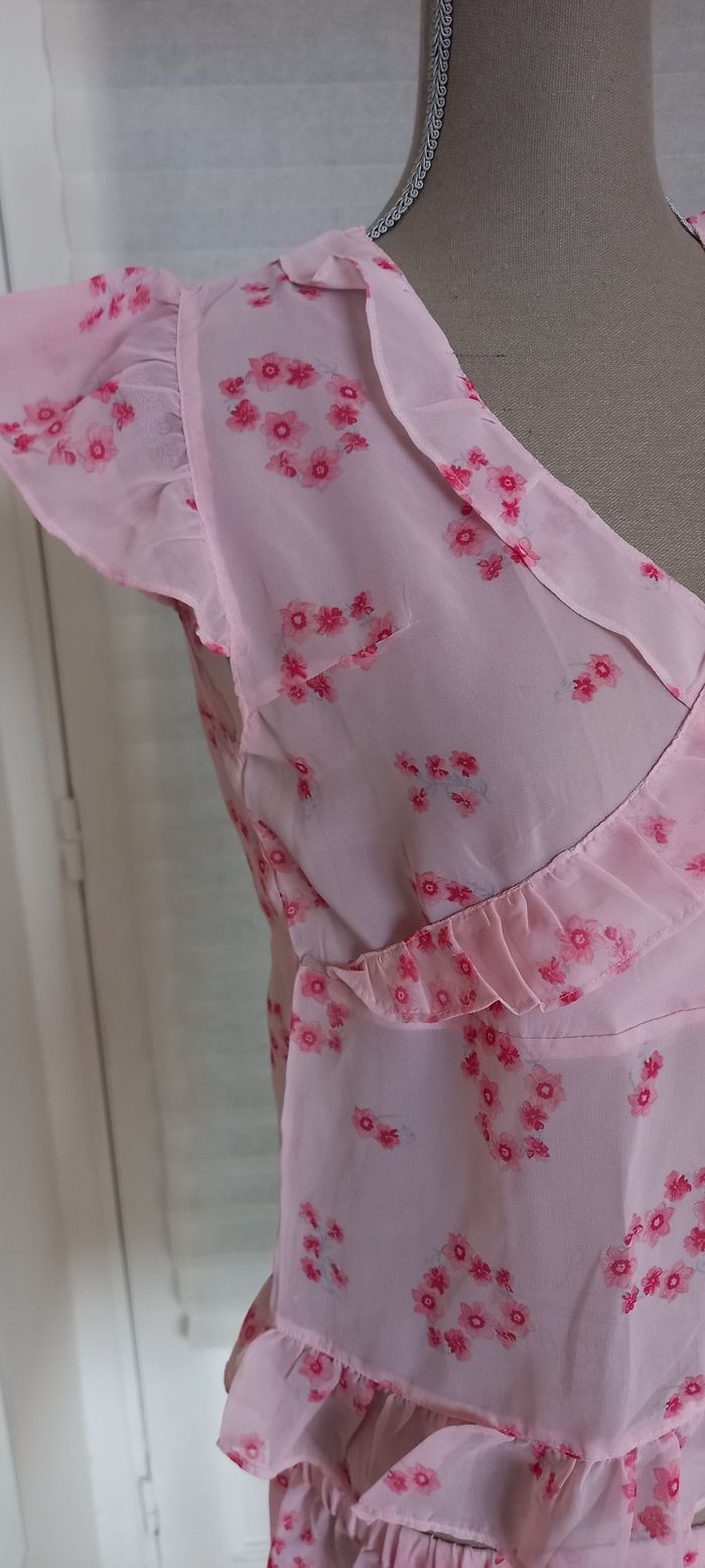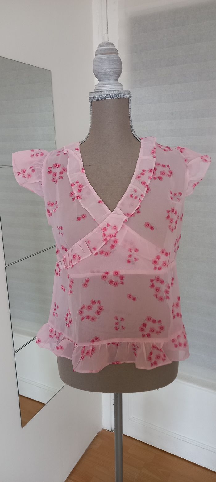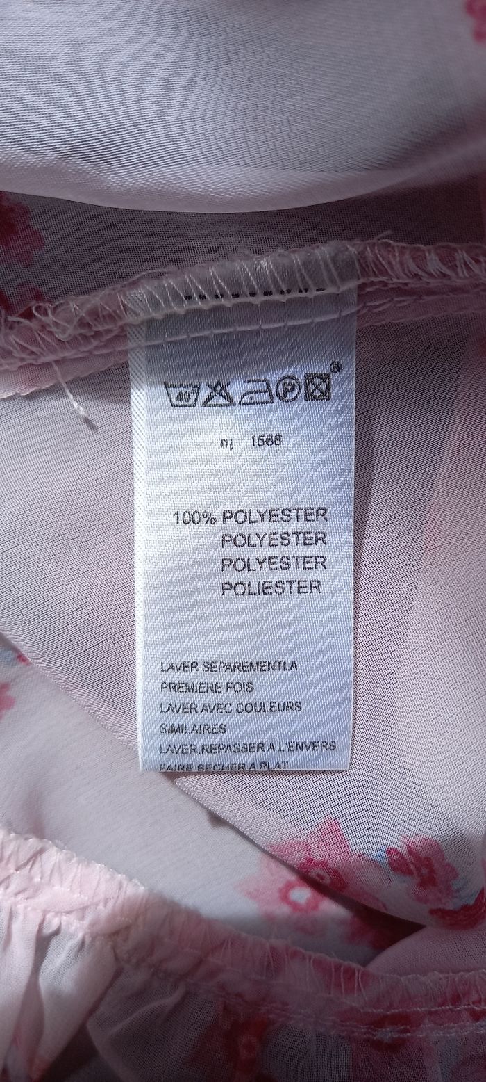 Ensemble nuit rose de taille M matière polyester, haut croisé volanté ainsi que les manches et le bas. Sa longueur est de 53cm, largeur de aisselle à aisselle 47cm.