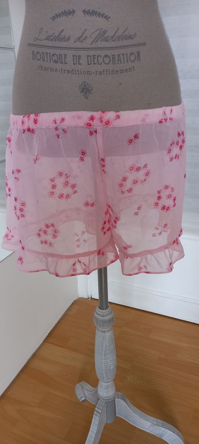 Le short est également volanté dans tout le bas, ceinture élastiquée, longueur du short 29cm, motifs petites fleurs.