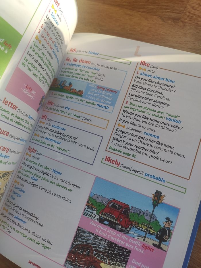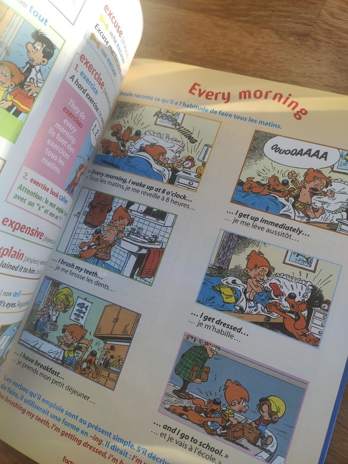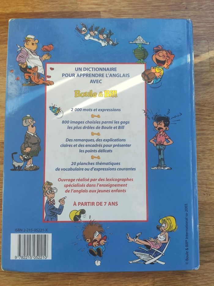 Apprends l'anglais avec Boule et Bill, un dictionnaire anglais français et français anglais. Édition Fleurus. La couverture est abîmée, surtout dans les coins mais pages intérieures en très bon état