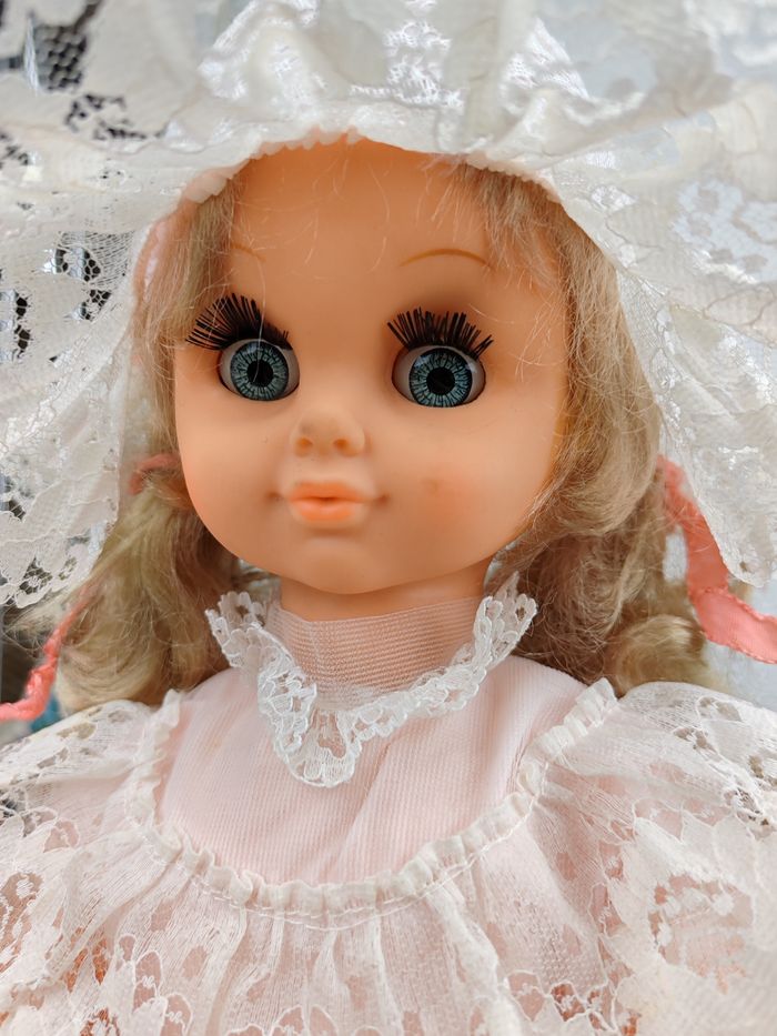 En vinyle, yeux fixes avec cils, cheveux implantés.