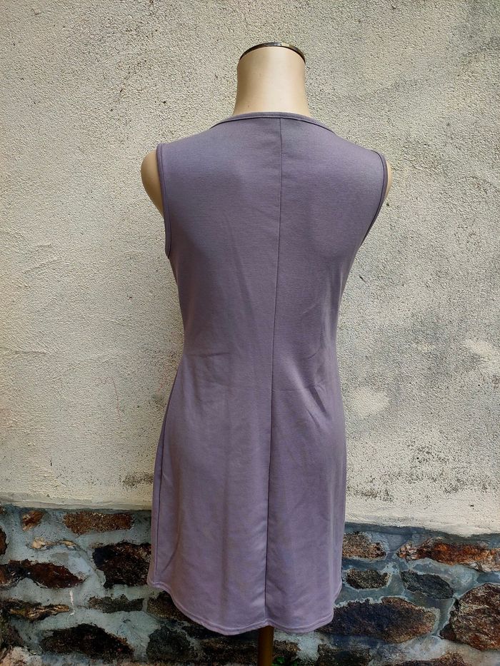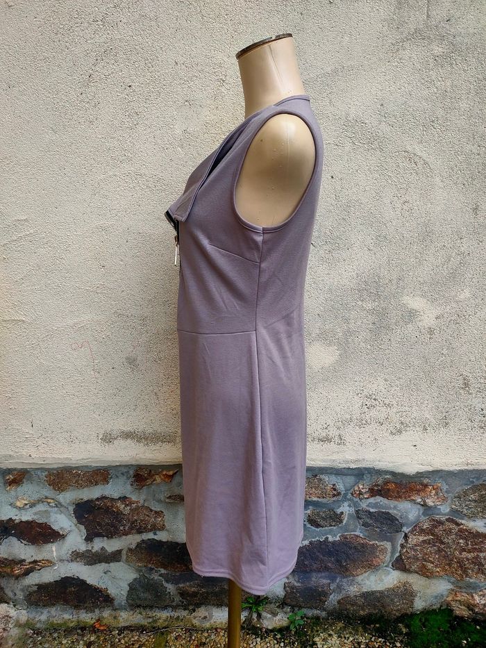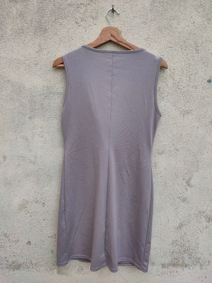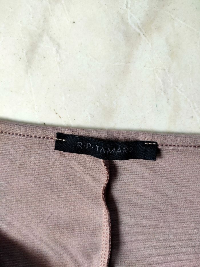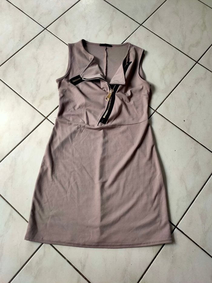 Robe coloris taupe/beige, sans manches, décolleté croisé avec fermeture éclair ajustable, coupe près du corps sans être moulante. Marque R.P Tamar, Fabriquer en France, taille 42. Elle est en très bon état.