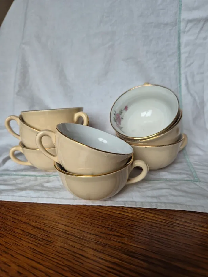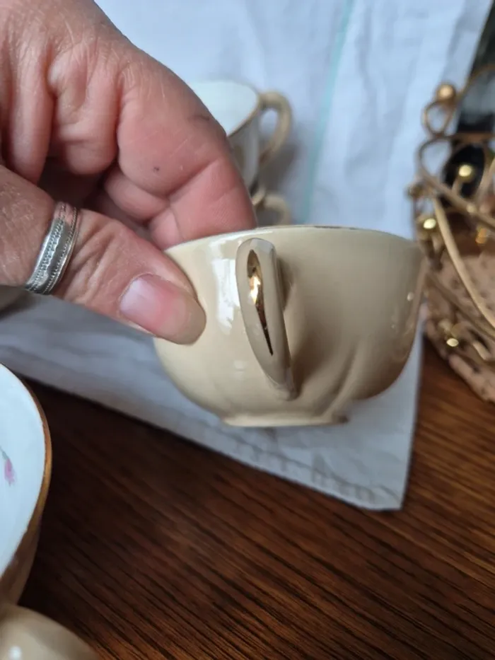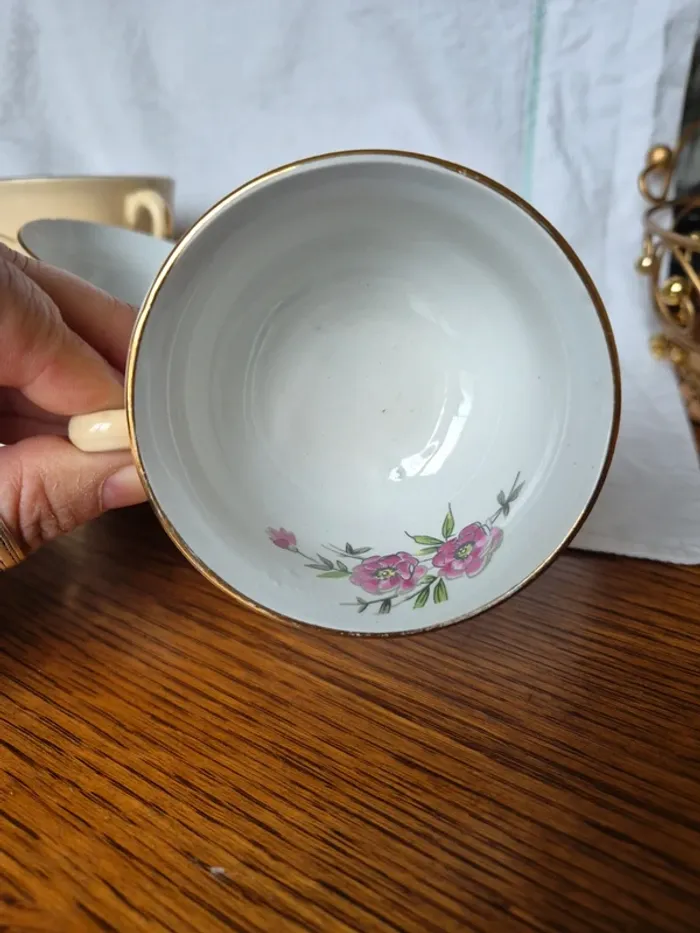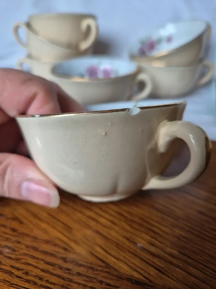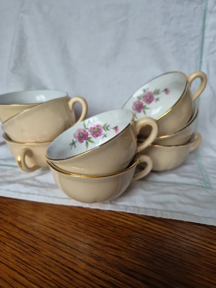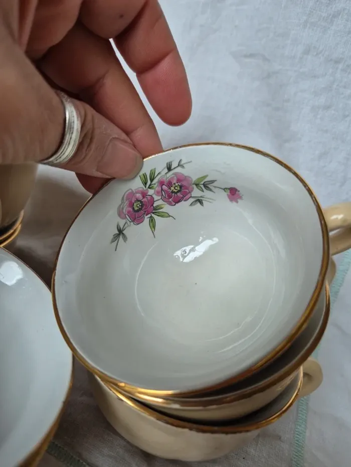 ⬇️mes autres annonces d'article de maison, décoration👉 #cg89déco un lot de 8 tasses à café ou à thé, elles sont beige à l'extérieur et blanches à l'intérieur avec une fleur de couleur rose. Le pourtour à un liseré doré. bon état mais une tasse est ébréchée - voir photo N'hésitez pas à me contacter pour plus d'informations ou de photos. #tasseacafé #doré #vaisselle #tasse