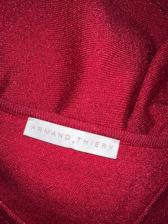 Pull - Excellent état - Taille 38 équivalent M Dimensions en bas de l’annonce - Rouge bordeaux et argenté - Tissus pailleté et strass argentés - Marque Armand Thiery - Ajouré, ouvert au niveau des bras - Manches chauve souris - Pas d’étiquette de taille ni de matière Dimensions: - 55cm niveau aisselles - 65cm de long