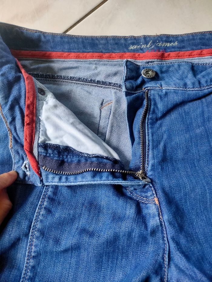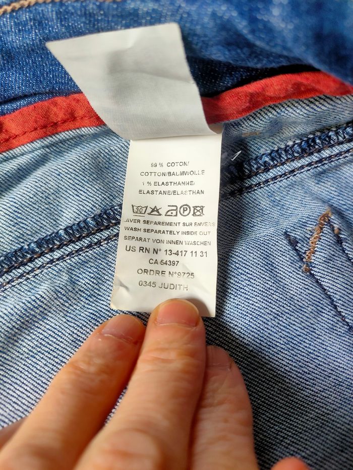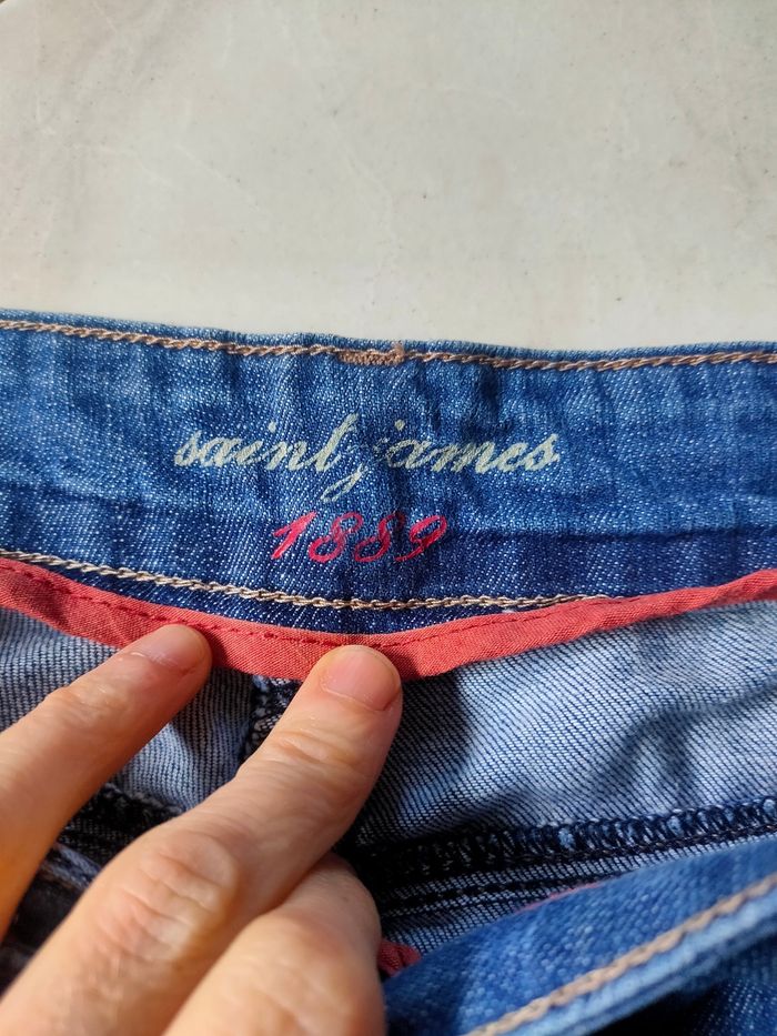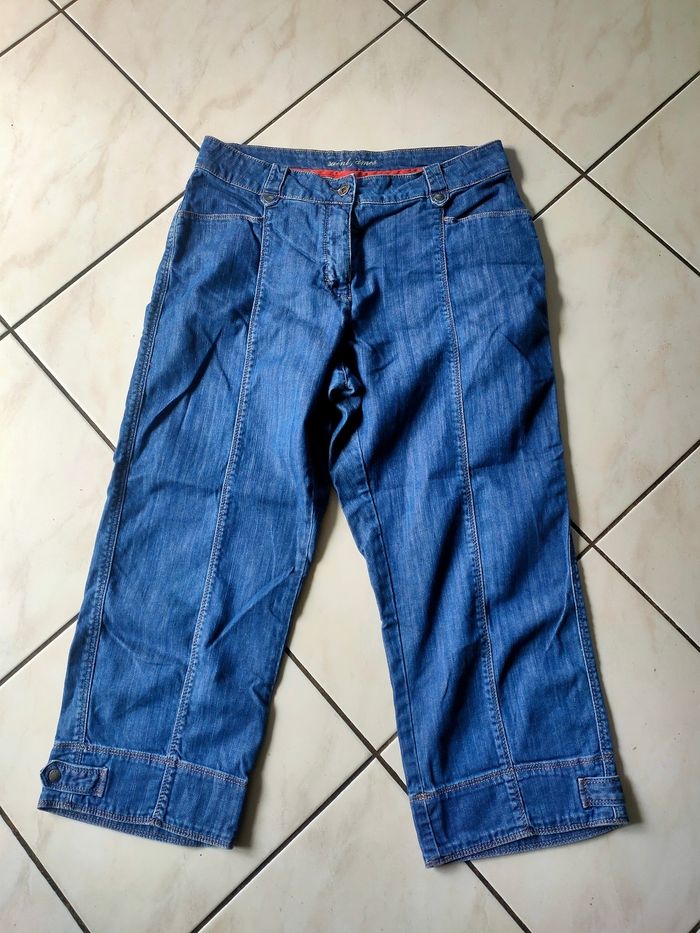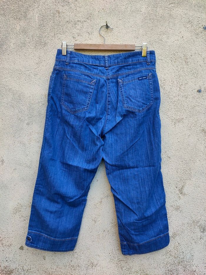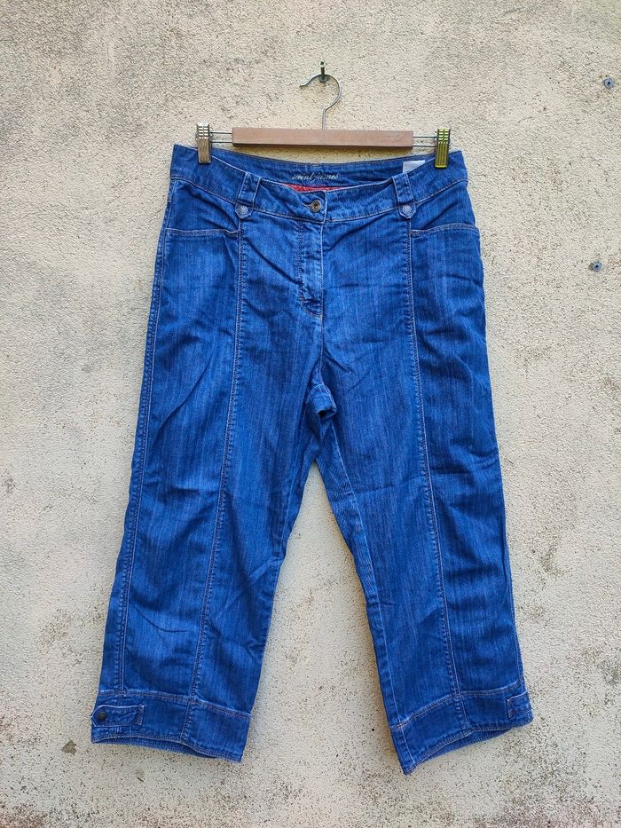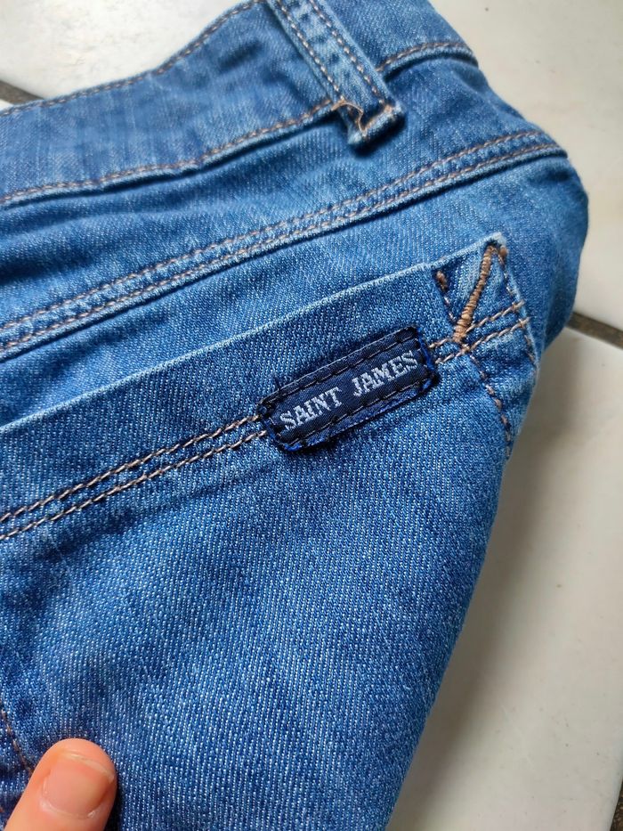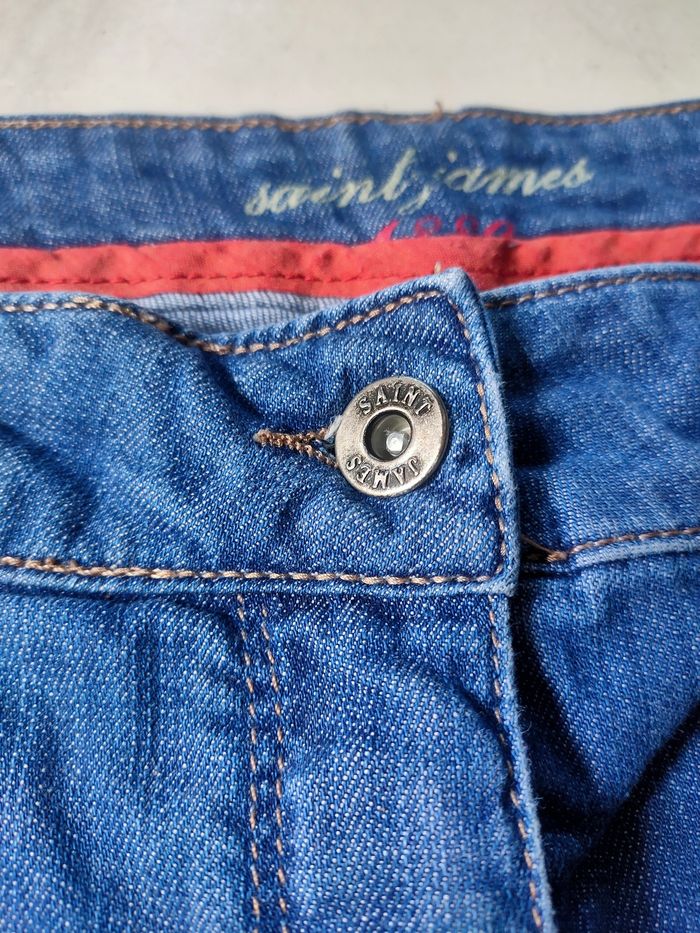 Pantacourts en jeans, coloris bleu, coupe droite, passant a la taille pour y mettre une ceinture au besoin. Il peut être aussi bien porté été comme hiver avec des bottines. Marque Saint James, taille 42 FR. Il est en très bon état.