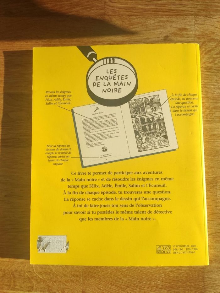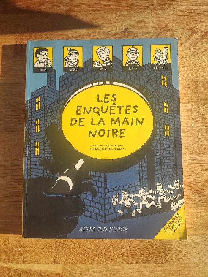 Ce livre permet de participer aux aventures de la "main noire" et de résoudre les énigmes en même temps que Félix, Adèle, Emilie, Salim et l'Ecureuil. A la fin de chaque épisode, tu trouveras une question. la réponse se cache dans le dessin qui l'accompagne. A toi de faire jouer ton sens de l'observation pour savoir si tu possèdes le même talent de détective que les membres de la "main noire". Livre en bon état, couverture un peu abîmée, édition Actes Sud junior