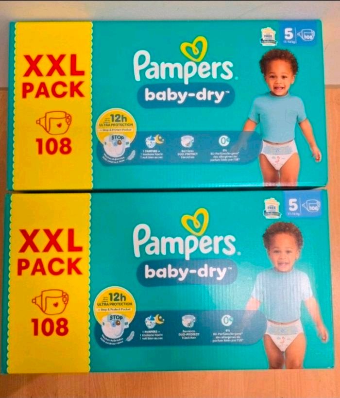 Couches Pampers Baby-Dry offrant confort et protection au quotidien 👶✨ Taille 5, adaptées aux enfants de 11 à 16 kg. Lot économique de 432 couches.