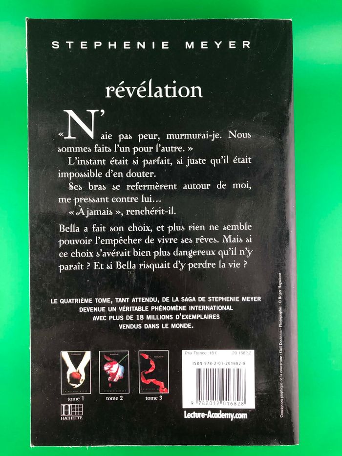 Réduction dès 2 articles achetés 5%, 3 articles 10%, 5 articles et plus 20% Me demander SVP pour que j'applique la réduction avec les frais de port au plus bas. Voici une bonne nouvelle pour tous les fans de la série Fascination de Stephenie Meyer. En effet Hachette vient d'annoncer la date de parution du tome quatre de la série. Si l'on savait déjà depuis quelques mois qu'il y aurait bien une suite après les trois premiers, nous savons dorénavant qu'elle paraîtra le 22 Octobre 2008. Si l'on ne connaît pas encore le titre français définitif, on sait déjà que la collection Black Moon, dans laquelle cette série est éditée depuis le début, reprendra la couverture anglaise. Et comme une bonne nouvelle n'arrive jamais seule, les éditions JC Lattès viennent d'annoncer la traduction de « Host », le thriller de Stephenie Meyer jusque-la inédit en Français. Si l'on sait déjà que « Les âmes vagabondes » devrait paraître en Octobre, on ignore encore la date exacte. En revanche, il semblerait plutôt destiné à un public adulte. Et pour celles et ceux qui n'ont pas encore lu les trois premiers tomes de la série, précipitez vous vite pour découvrir l'histoire d'Isabella qui emménage avec son père dans une petite ville triste et pluvieuse. Au lycée, elle rencontrera Edwards, un adolescent beau et mystérieux. Bien vite elle est fascinée par cet étrange garçon avec qui elle entretient des rapports ambiguës jusqu'a découvrir qu'il n'est pas humain... Il vous reste donc encore quelques mois pour dévorer ce pur chef d'oeuvre qui porte bien son titre et qui à déjà amplement mérité son succés du premier au dernier tome. Et enfin pour ceux qui ont déjà lu et relu Fascination, Tentation et Hésitation, il reste une consolation. En effet, vous pouvez encore découvrir « Nuit d'enfer au paradis », un recueil de nouvelles paru en mars et auquel à participé Stephenie Meyer. Les plus grandes auteurs américaines ont d'ailleurs participé à ce recueil constitué de récits fantastiques autour d'un bal