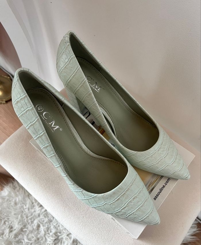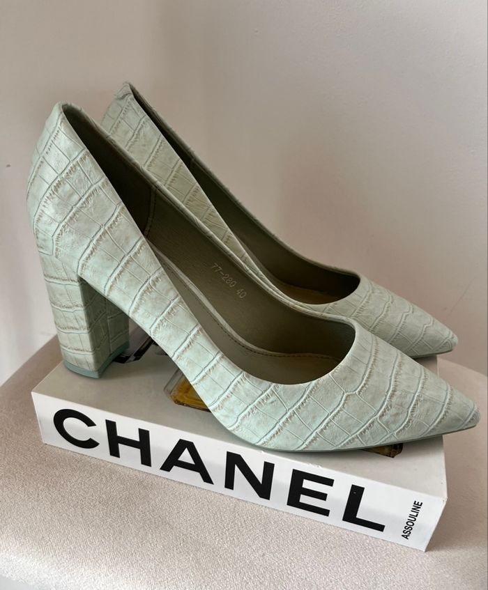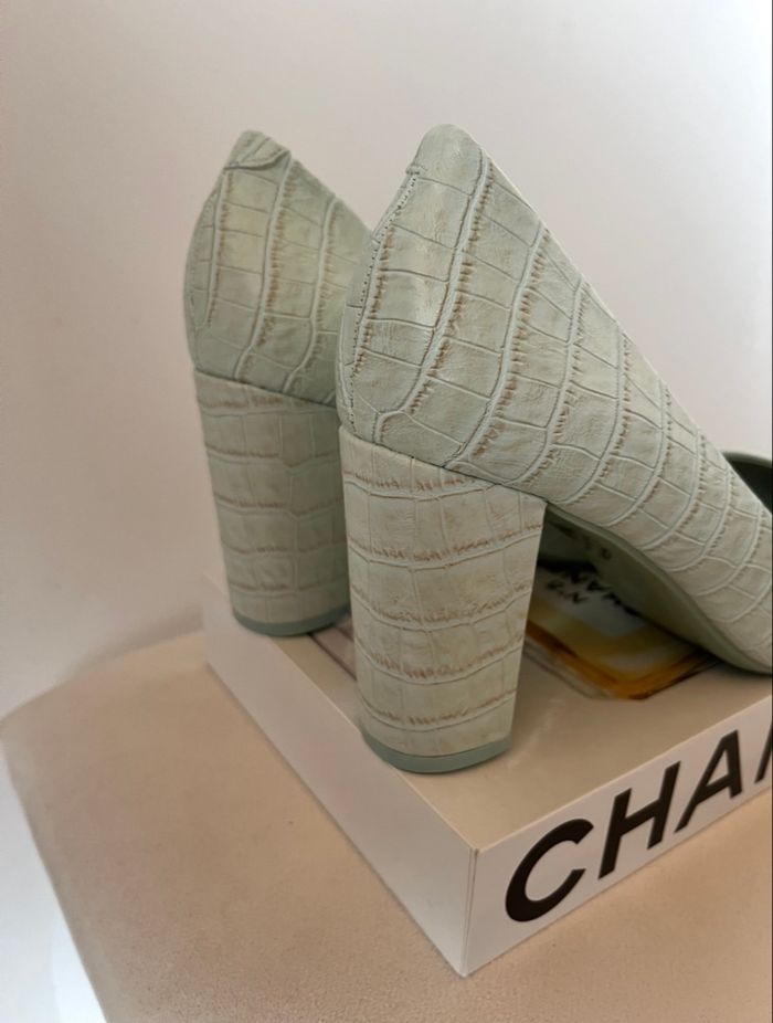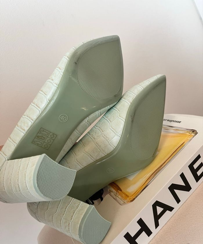 〰️ Sandales talon carré, couleur vert pastel, motifs croco, bout pointu