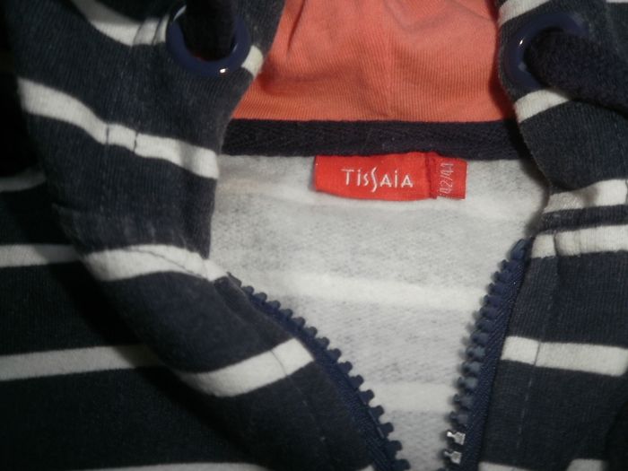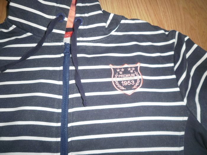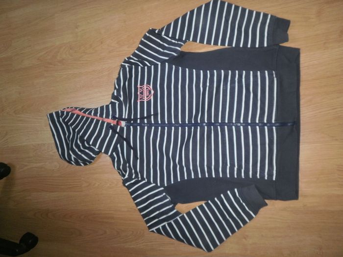 Bonjour, Je vends cette veste zippée à capuche pour Femme en taille 42/44 et de marque Tissaïa Coloris : à rayures bleues et blanches. Composition : 60% coton - 40% Polyester. En très bon état. Prix demandé : 4€