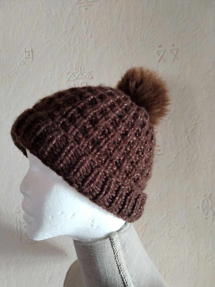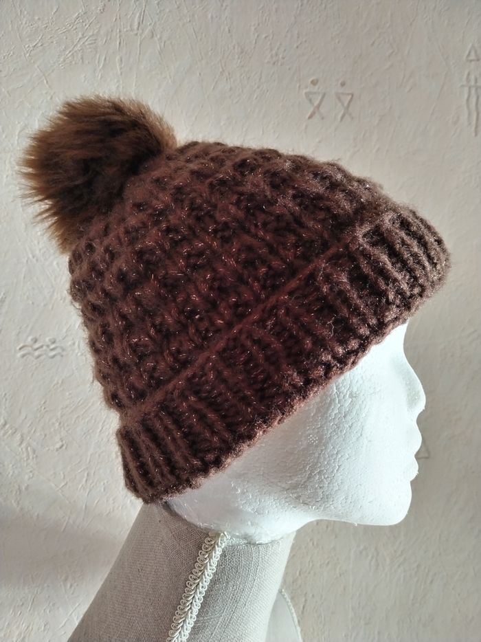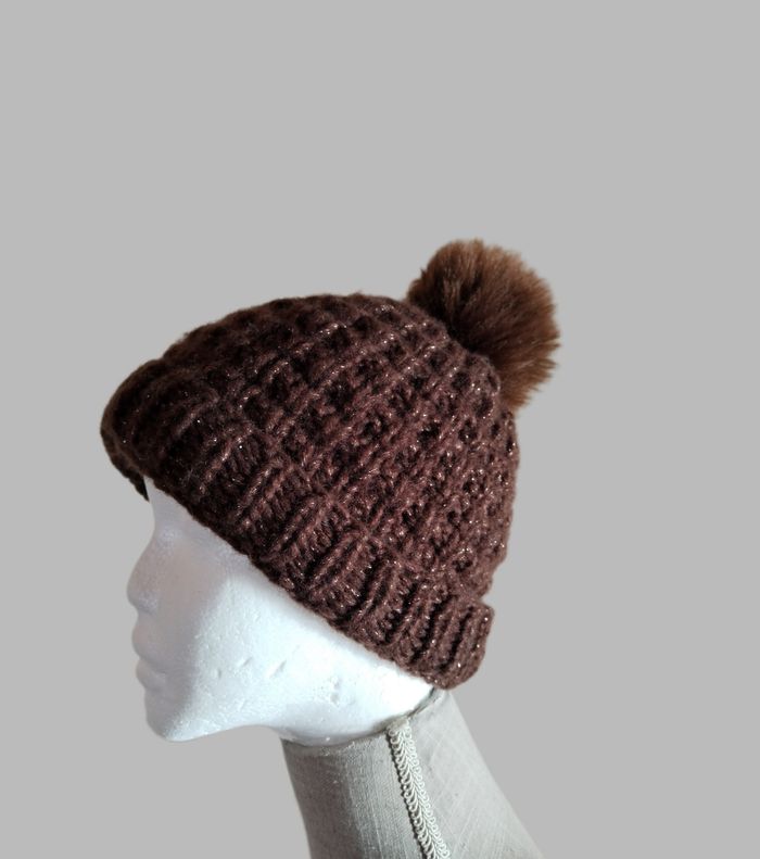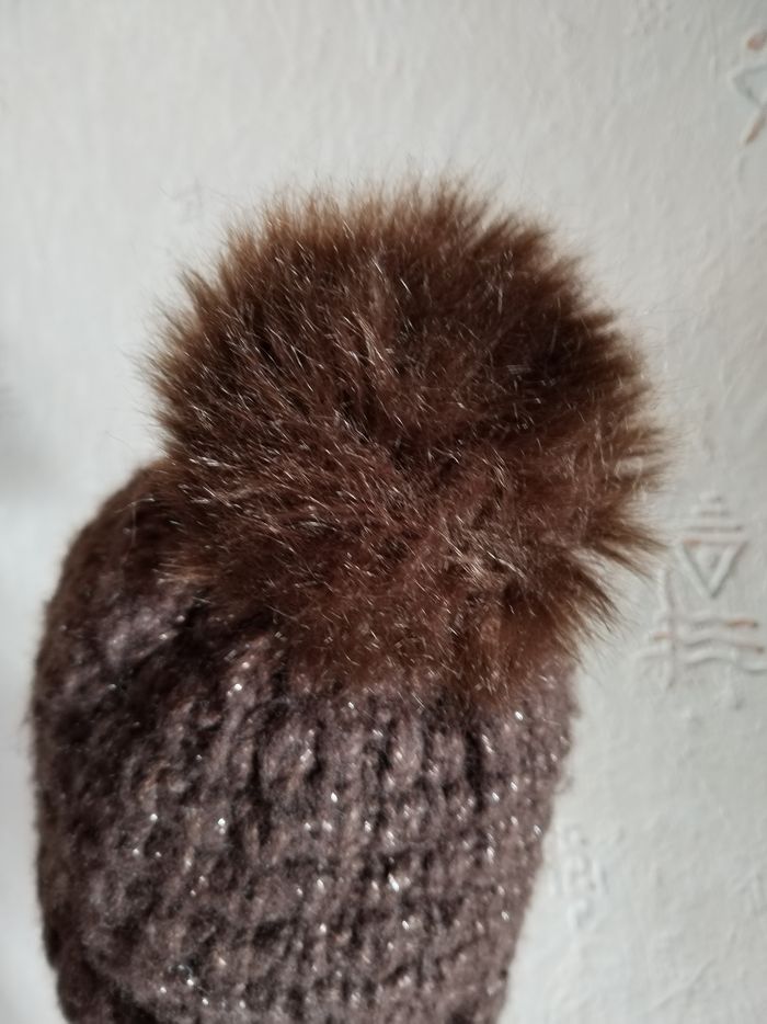 Joli Bonnet marron avec Pompon fausse fourrure