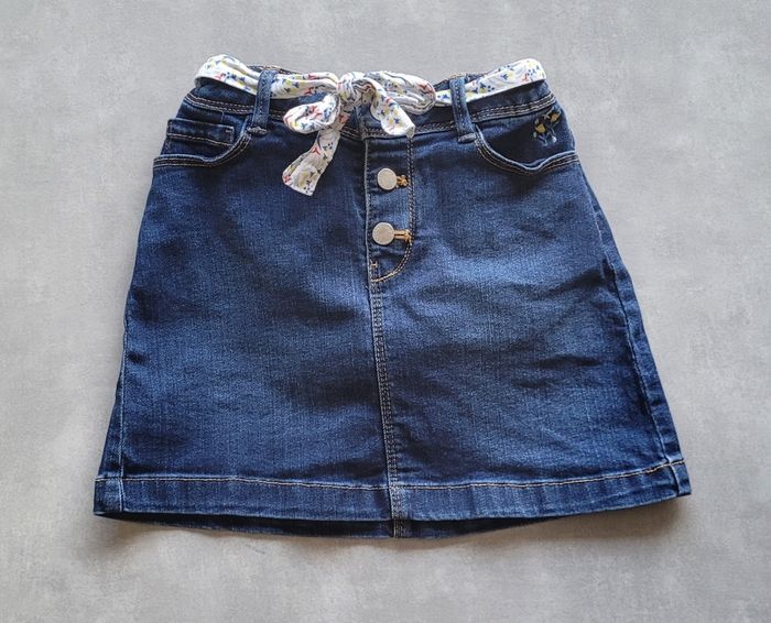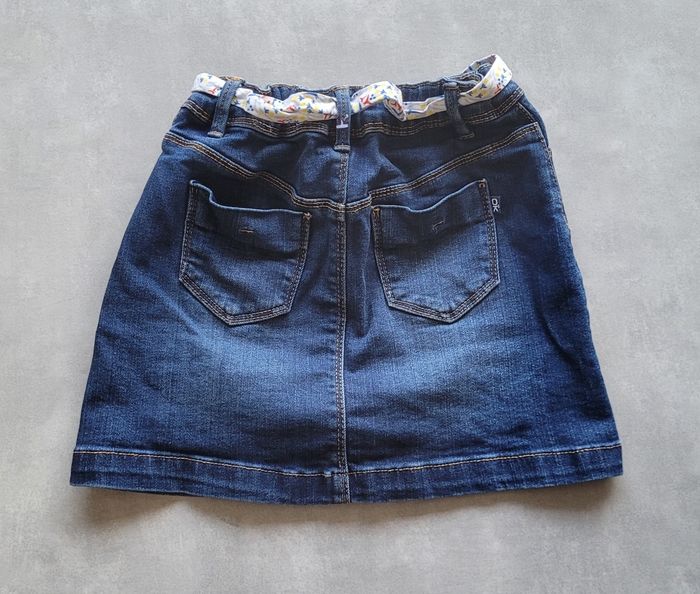 Jupe en jean, de couleur bleu foncé, avec ceinture en tissus fleuri, de la marque Okaidi, taille 5 ans (110 cm), en très bon état. Article lavé pour la vente.