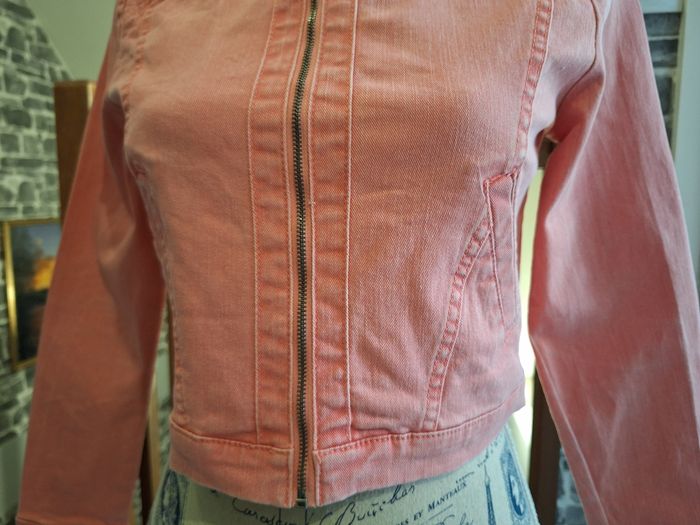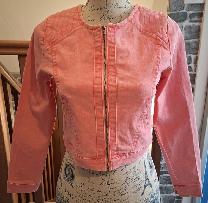 Veste en jean zippée couleur corail brodée et imprimée au dos - photo numéro 1