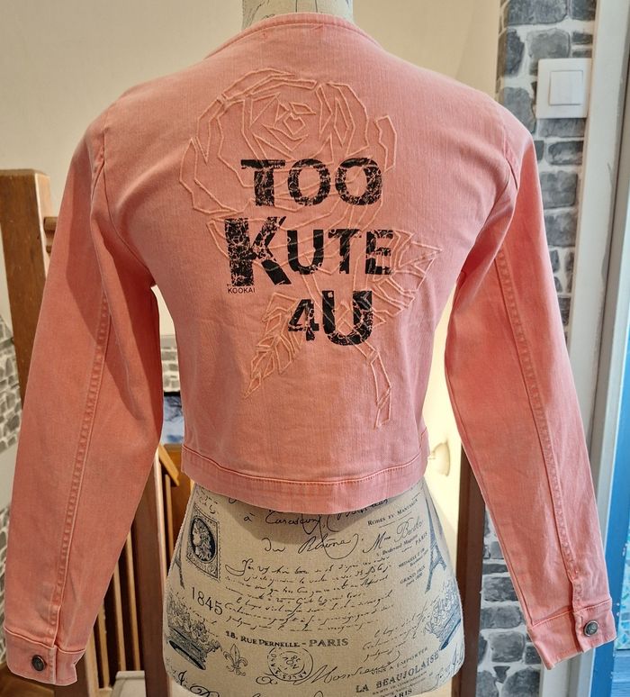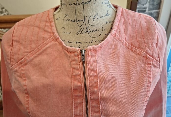Veste en jean zippée couleur corail brodée et imprimée au dos - photo numéro 2
