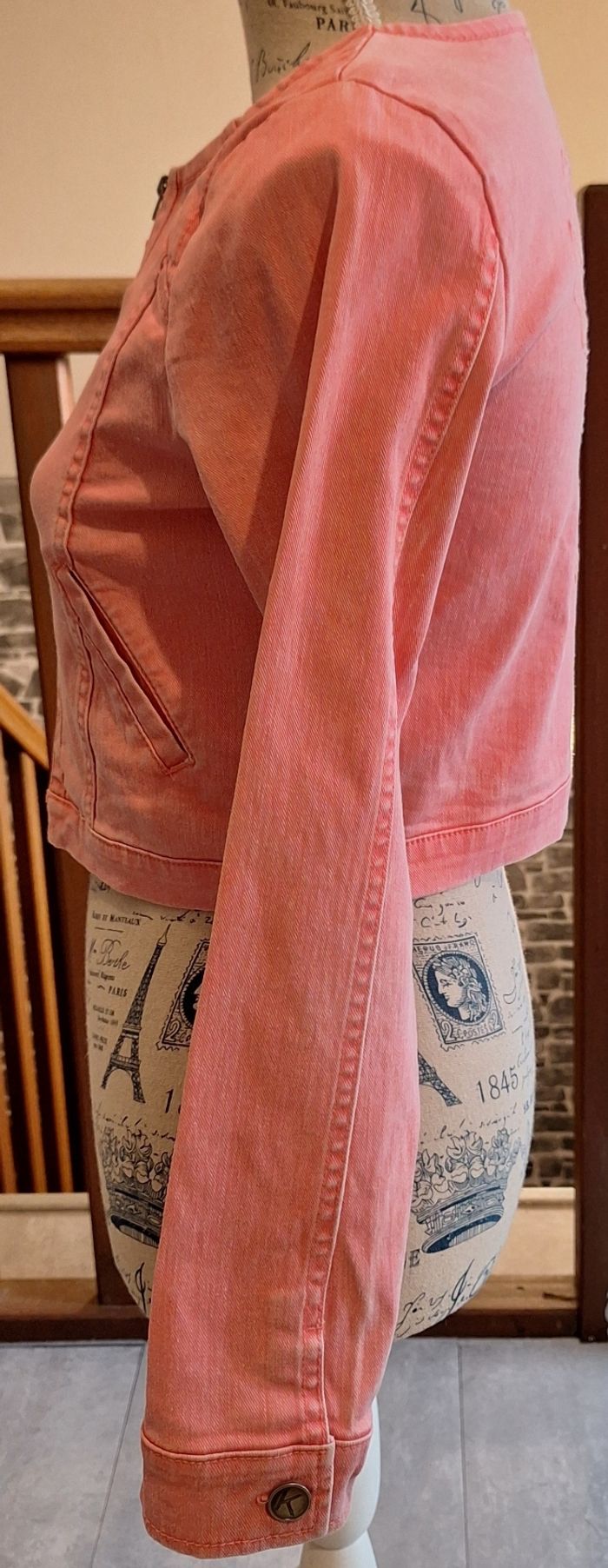 Veste en jean zippée couleur corail brodée et imprimée au dos