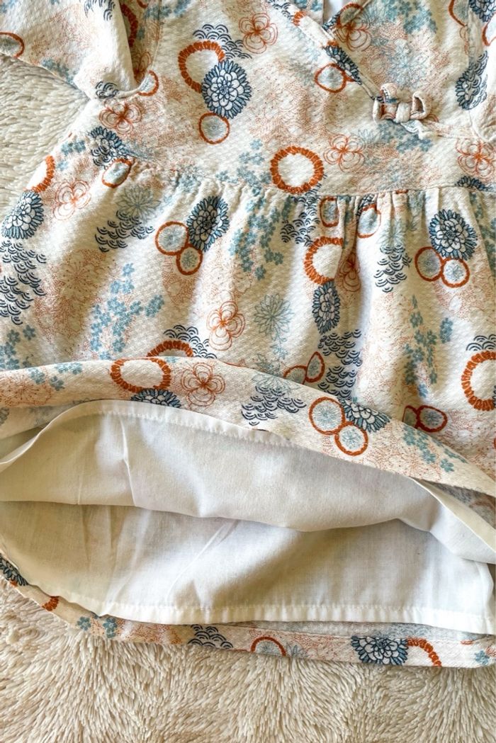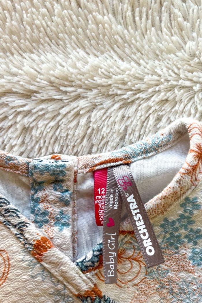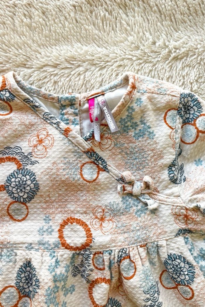 De la marque Orchestra, cette adorable robe possède d’un petit noeud décoratif, 3 petits boutons de fermeture dans le dos, d’une doublure, les manches sont bouffantes et élastiques aux poignets.