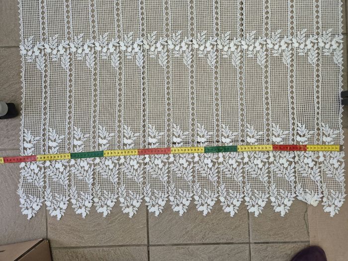 Le rideau présente des motifs floraux délicats et un travail de maille type filet très élégant qui laisse passer la lumière tout en protégeant votre intimité.
