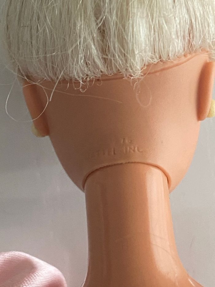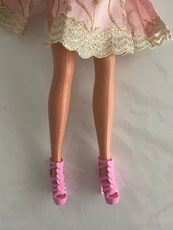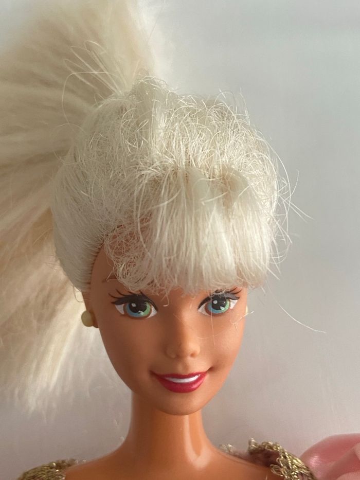 • Marque : Mattel • Époque : Année 1976 (Marquage Mattel Inc sur la nuque) • Modèle : Barbie avec moule de visage "Superstar", yeux bleus/verts et cheveux blonds clairs. • Tenue : Magnifique robe de soirée en satin rose brillant, ornée de motifs pailletés dorés, d'un liseré de dentelle dorée et d'une petite rose en tissu au centre du bustier. • Accessoires inclus : Paire de chaussures à talons compensés roses avec détails de cœurs (chaussures modernes). État de conservation : • Corps : En bon état général, les articulations fonctionnent normalement. • Visage : Maquillage d'origine très bien conservé, aucune rayure apparente. • Cheveux : Blonds, volumineux. Un brossage pourrait être nécessaire pour redonner de la souplesse à la coiffure. • Vêtement : Propre, pas de déchirure majeure. La fermeture à l'arrière est fonctionnelle.