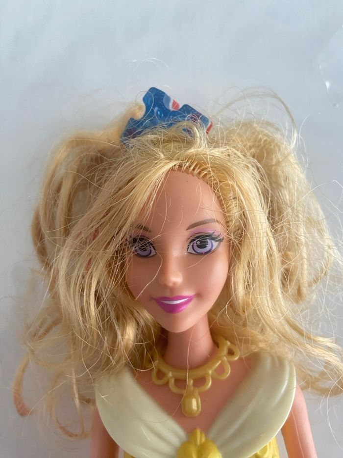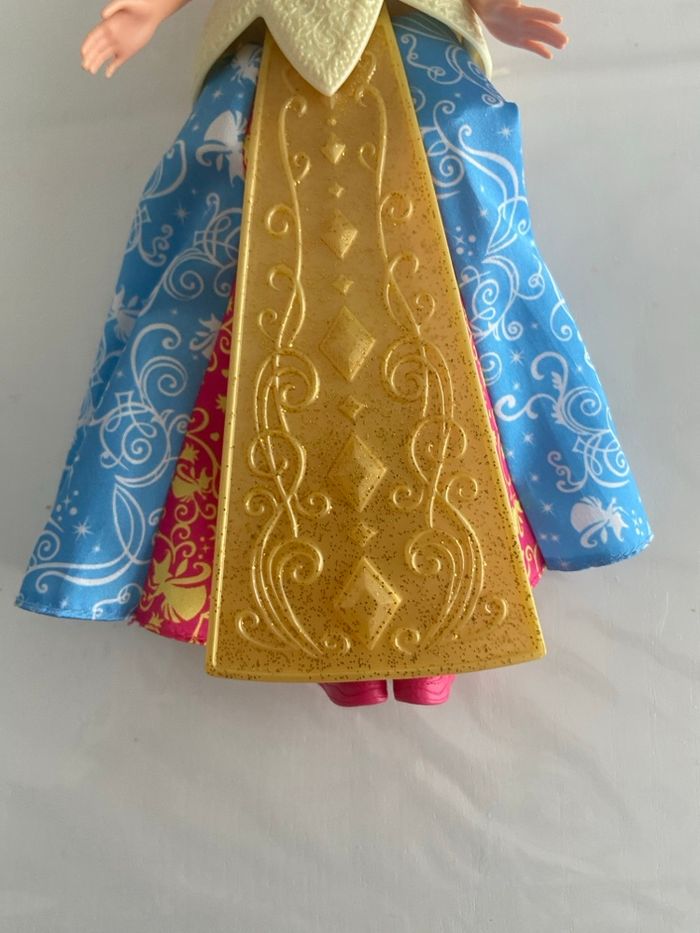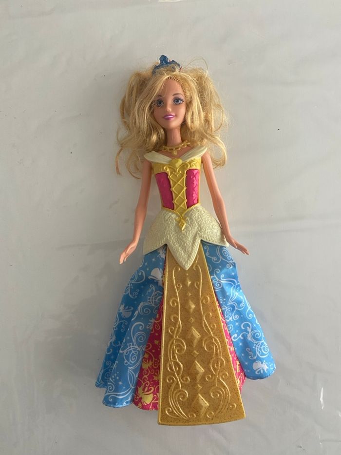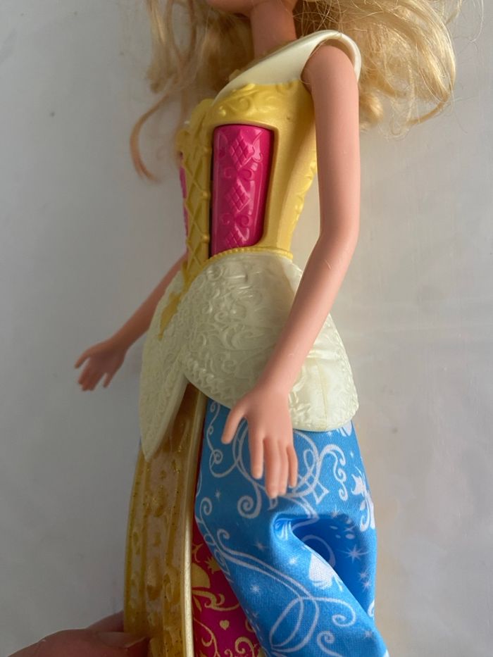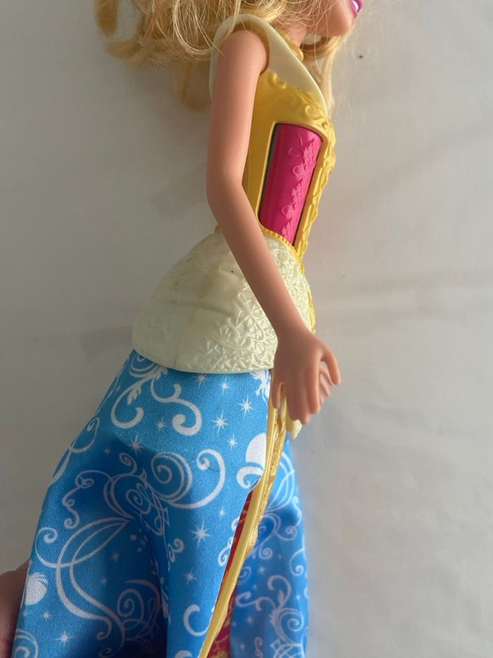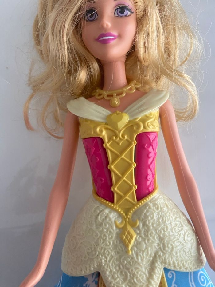 Poupée officielle Disney Princess représentant Aurore, issue du film La Belle au Bois Dormant, fabriquée par Mattel. Modèle de 2012 (année gravée sur la nuque). ✨ Détails : • Personnage : Princesse Aurore • Marque : Mattel • Année : 2012 • Buste rigide sculpté rose et jaune, avec détails de laçage à l’arrière • Jupe en tissu satiné bleu et rose, décorée de motifs de volutes et silhouettes Disney • Sur-jupe rigide dorée à paillettes sur le devant • Accessoires : • Collier amovible jaune/doré • Paire de baskets montantes roses marquées Barbie (accessoire ajouté) 🧸 État : • Visage : Très bon état, maquillage intact, yeux bleu/violet • Cheveux : Longs, blonds et bouclés, avec un petit accessoire bleu • Corps : Bon état général, bras et jambes articulés Poupée propre et bien conservée, idéale pour collectionneur, fan Disney ou enfant.