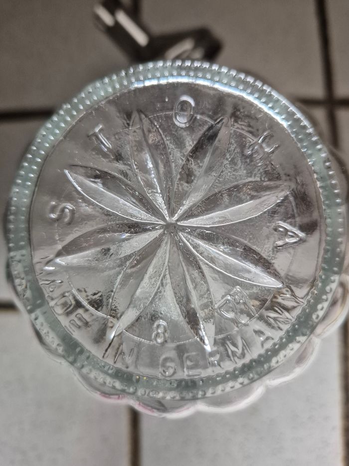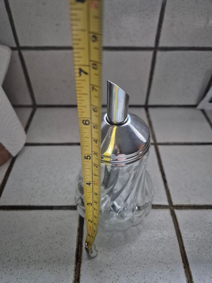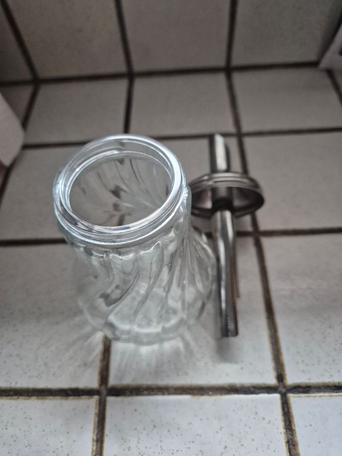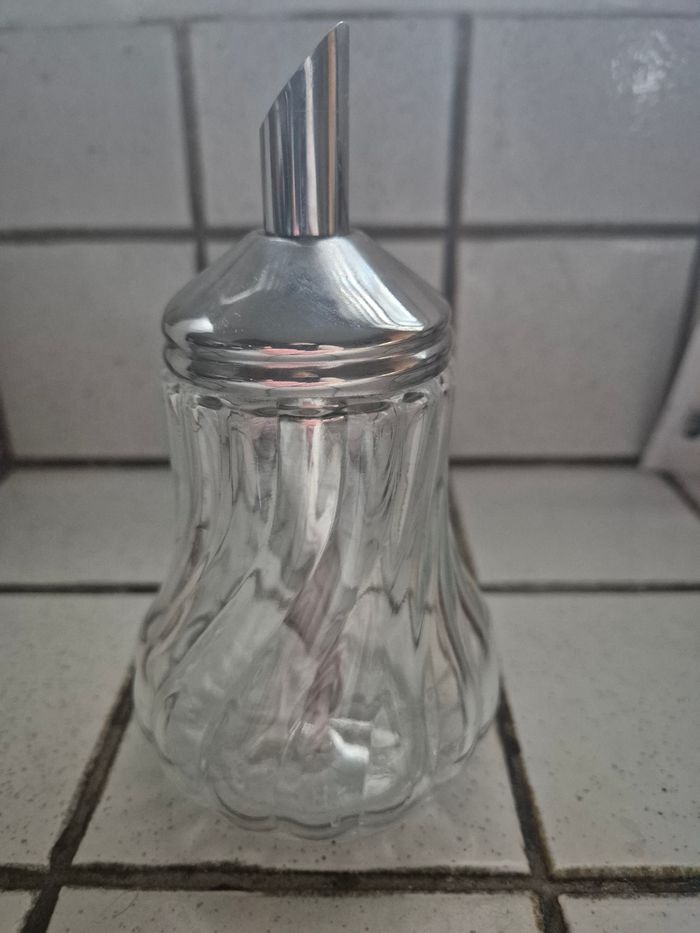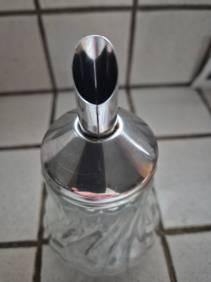 Récipient en verre épais avec un joli motif torsadé / Couvercle et bec verseur en acier inoxydable (inox).