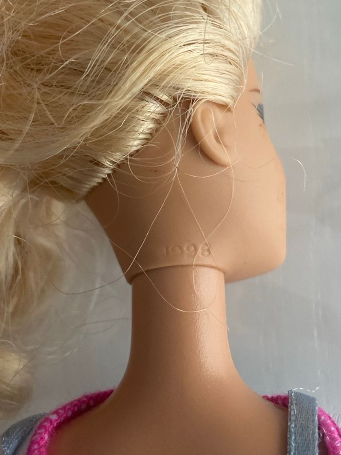 État : Occasion (Bon état général, voir photos pour les détails). Description détaillée : Ce lot comprend deux poupées emblématiques de la marque Mattel, parfaites pour compléter une collection ou pour offrir. 1. Poupée Barbie : • Marquage nuque : © 1998 Mattel, Inc. (Moule de visage "Generation Girl"). • Caractéristiques : Blonde aux yeux bleus, maquillage rose nacré. Elle possède des articulations aux coudes et aux poignets. • Tenue : Porte une tenue style salopette en jean avec un t-shirt imprimé palmier et des bottines bleues. 2. Poupée Ken : • Marquage nuque : © 2007 Mattel (Moule de visage moderne). • Caractéristiques : Cheveux blonds moulés, yeux bleus. • Tenue : Débardeur bleu à motifs graphiques, short violet et bottes grises futuristes / de sport. Points à noter : • Les poupées sont vendues avec les vêtements et accessoires visibles sur les photos. • Articulations fonctionnelles. • Envoi soigné et rapide.