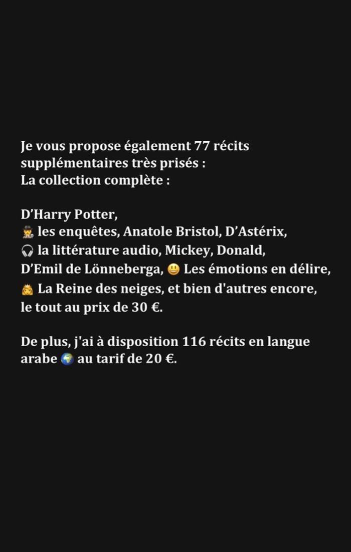 De plus, j'ai à disposition 116 récits en langue arabe 🌍 au tarif de 20 €.