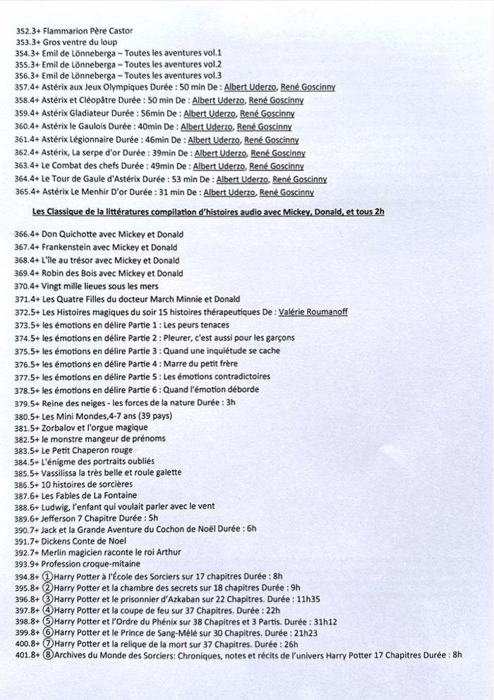 🪄 Harry 🪄 Harry Potter, 🕵️♂️ les enquêtes, Anatole Bristol, Astérix, 🎧 la littérature audio, Mickey, Donald, Emil de Lönneberga, 😃 Les émotions en délire, 👸 La Reine des neiges, et bien d'autres encore, le tout au prix de 30 €.