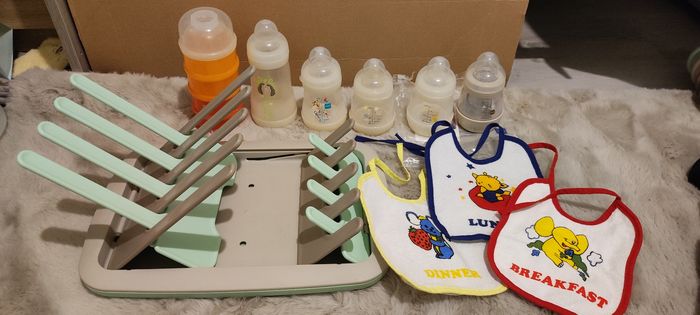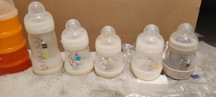 Vends ce lot de biberons anti colique de la marque Mam avec differents accessoires.