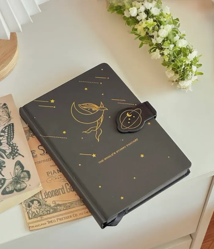 Carnet de croquis au papier noir, au format 12,5 × 18,5 cm. Idéal pour dessiner à l’encre blanche ou métallique, au crayon, au fusain ou aux pastels. Couverture rigide noire avec un motif doré représentant une baleine et une lune dans un ciel étoilé. Fermeture magnétique décorative avec médaillon astral. Un carnet artistique et inspirant, parfait pour vos créations lumineuses sur fond sombre.