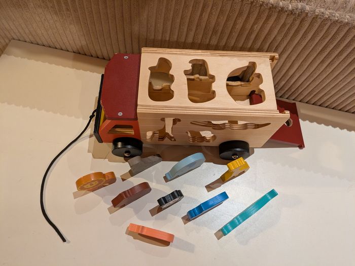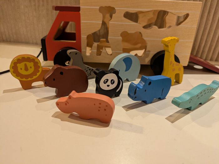 Jeu en bois avec animaux à encastrer et petite ficelle pour tirer le camion L'arrière s'ouvre aussi Jeu état neuf et complet, quasi jamais servi
