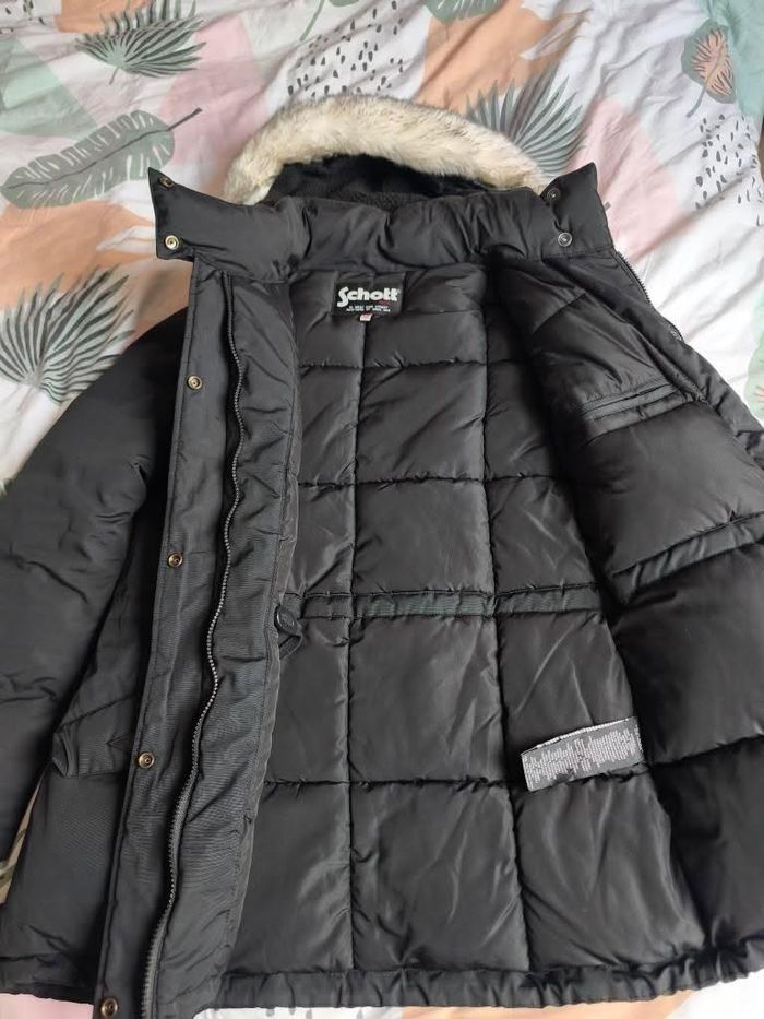 Manteau d ela marque Schott, jamais porté. Poche intérieure, et poches sur la poitrine avec fermeture éclair, poches extérieures fermeture à pressions. Rembourrage en plume étiquette en photo, la fourrure est amovible sur la capuche