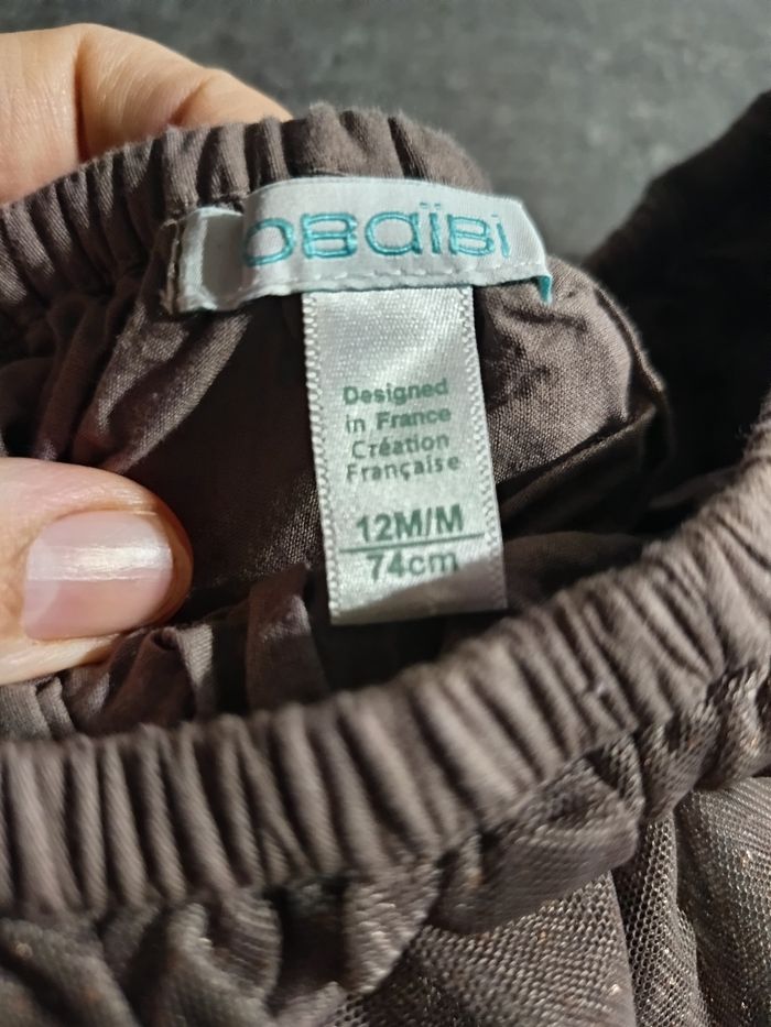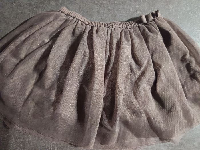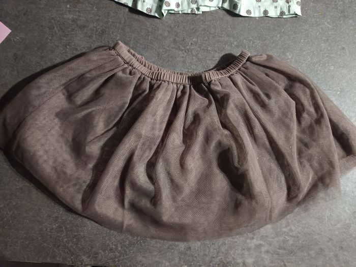 Ensemble 2 pièces : - 1 chemisier bleu ciel avec fleurs marrons (très bon état) - jupe en tulle marron avec paillettes (NEUVE jamais portée !) Taille 12 mois (74cm)