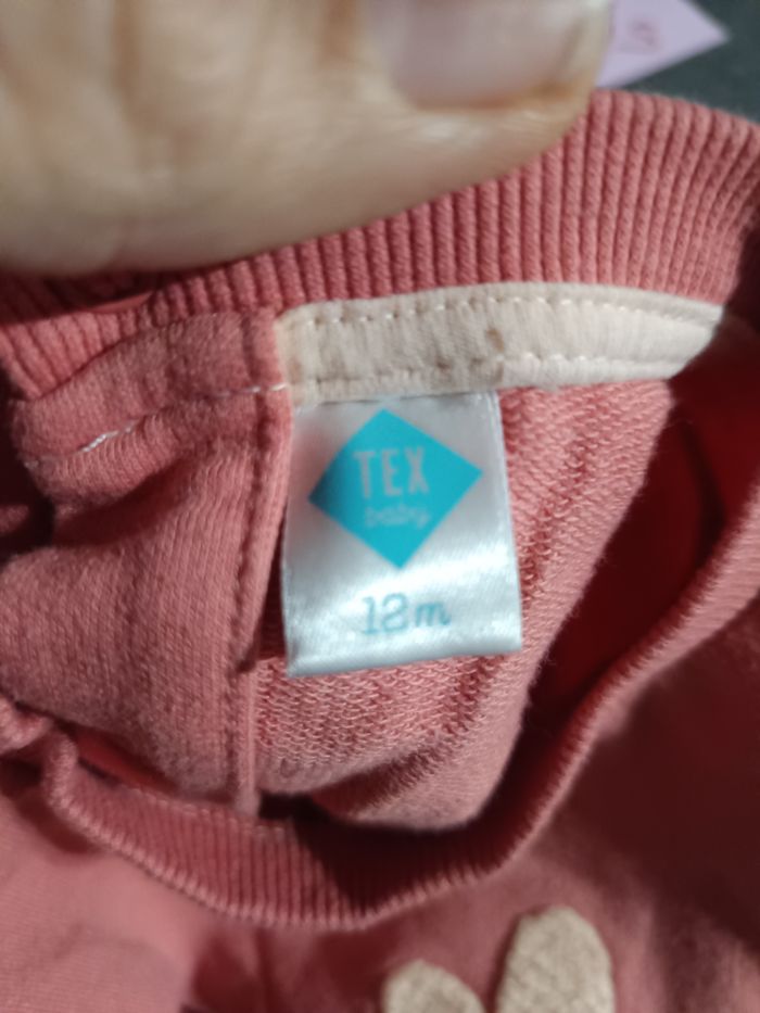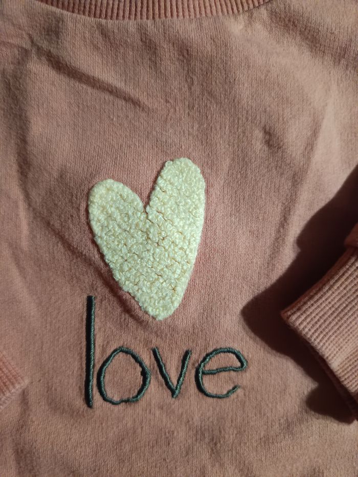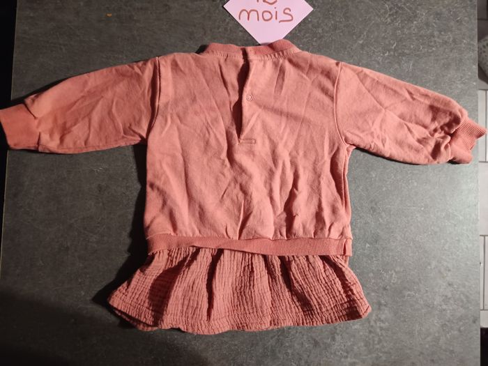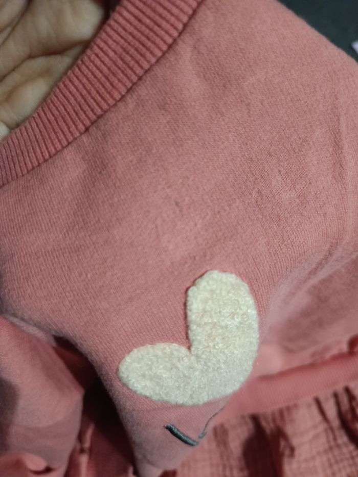 Robe bi matière, Haut en sweat avec petit coeur et inscription "love" Bas en gaz de coton Bon état, ⚠️petites taches (voir photo 3) Taille 12 mois