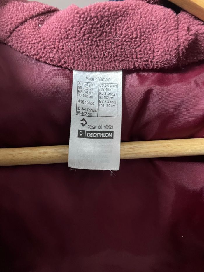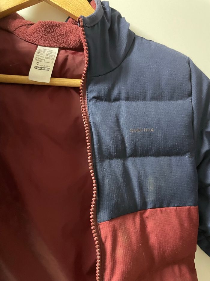 Doudoune Quechua bleu marine et bordeaux Taille 3-4 ans Légère tache sur l’avant gauche du manteau sous le logo (visible sur la photo).