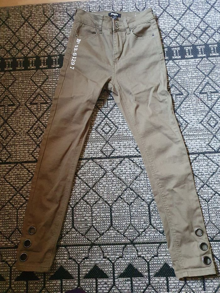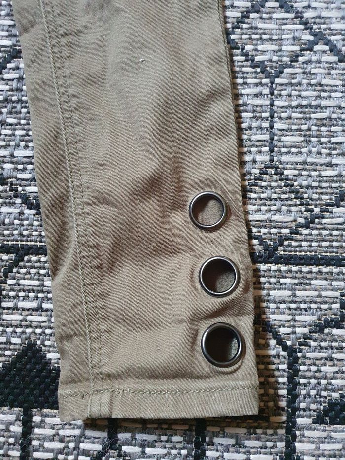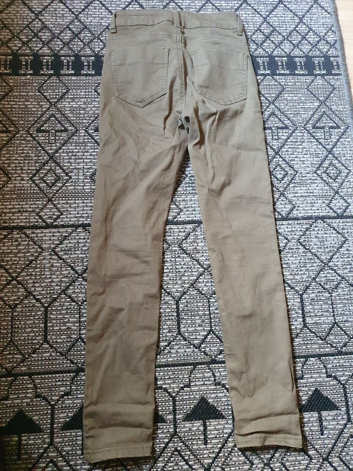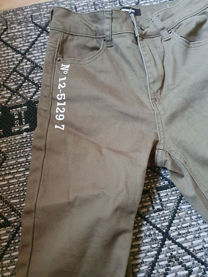 Jean kaki jennyfer slim / skinny avec inscription sur le côté et trous métal en bas. Très bon état. Taille 12/14 ans