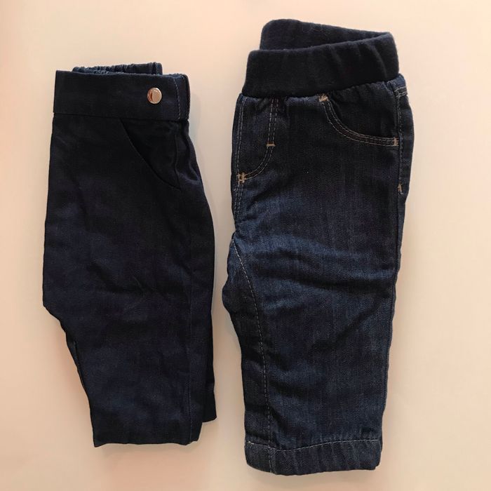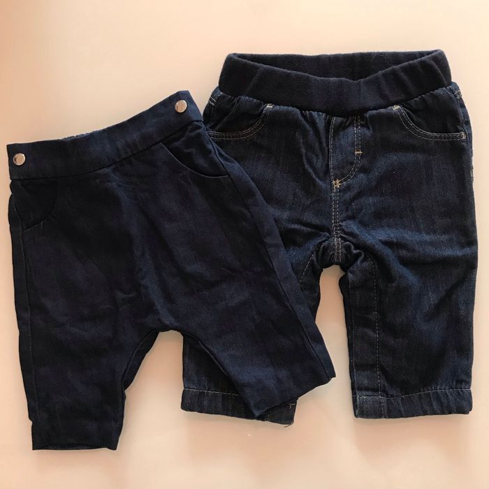 2 pantalons taille 1 mois ceinture élastique : - 1 jean PETIT BATEAU - 1 jean JACADI PARIS