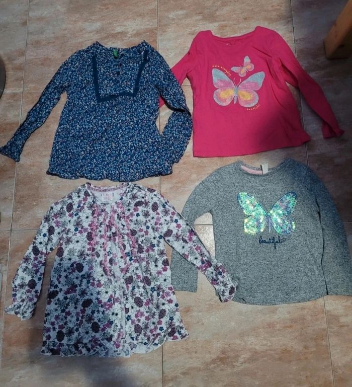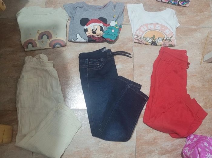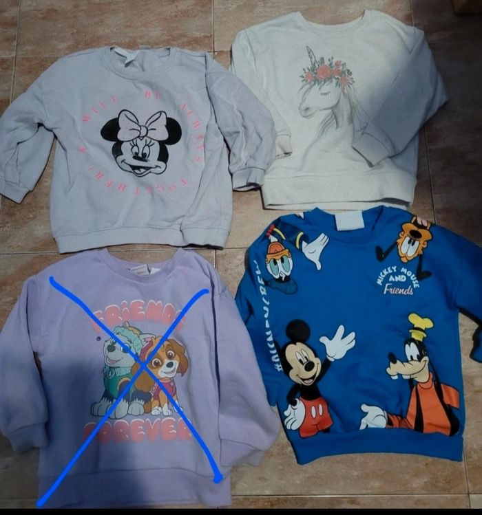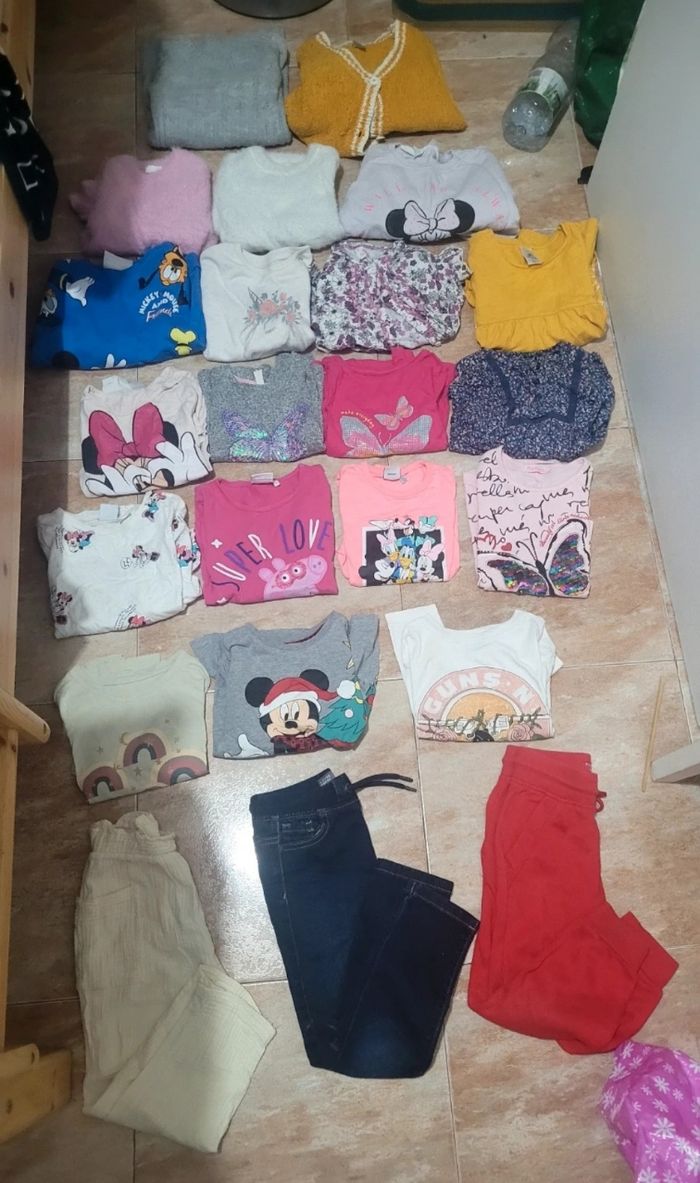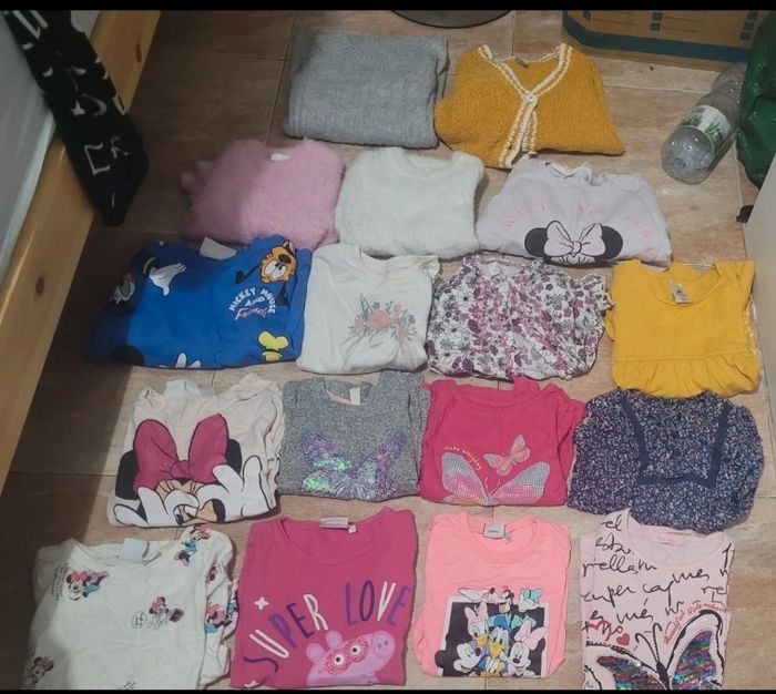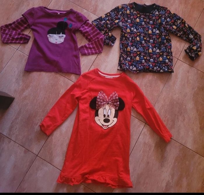 Taille 4-5 ans. H&M, Lovely Orchestra, Nameit, Tuc Tuc… et bien d’autres… En excellent état. Contient : 3 pantalons, 13 t-shirts, 6 sweats, 1 gilet, 1 robe épaisse, 1 robe Minnie et 1 pull.