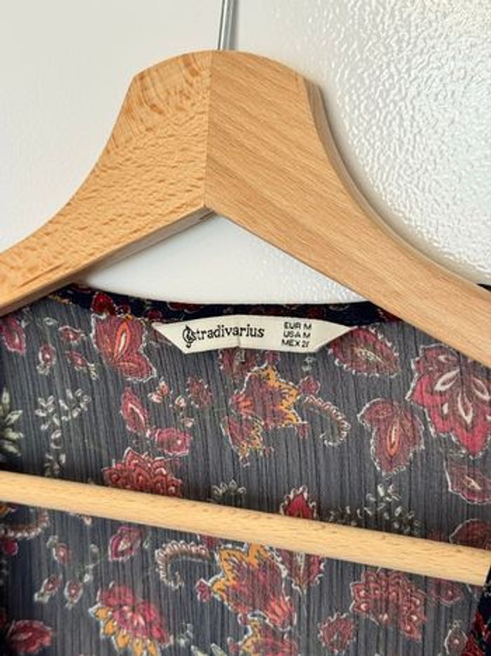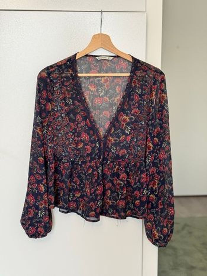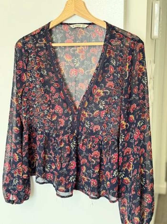 Blouse légère et fluide à imprimé floral dans des tons bordeaux/rouge sur fond foncé.