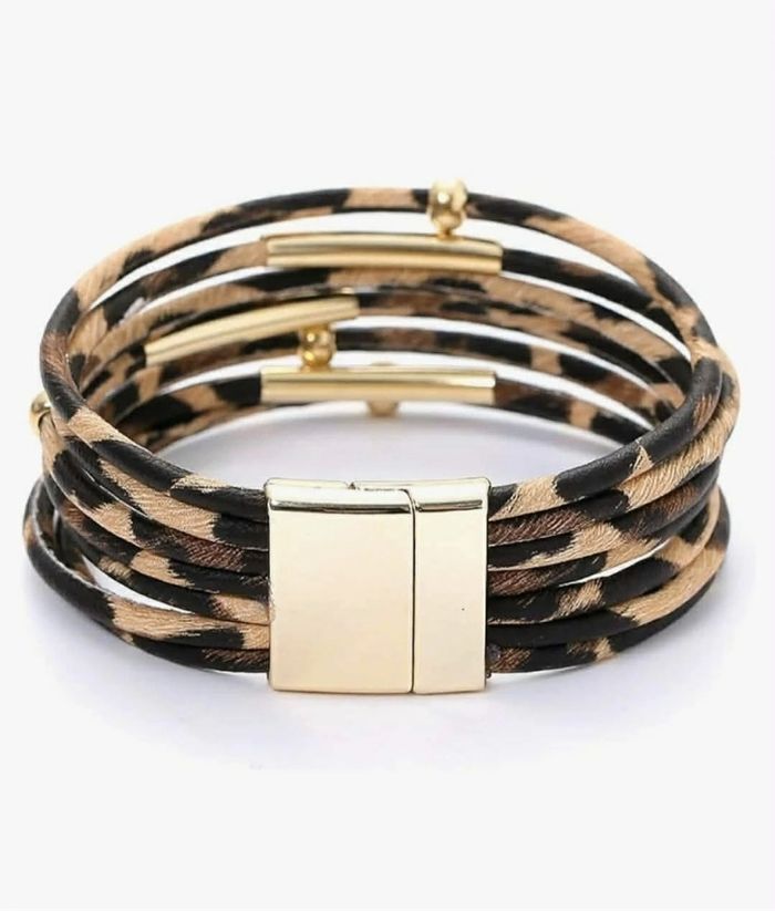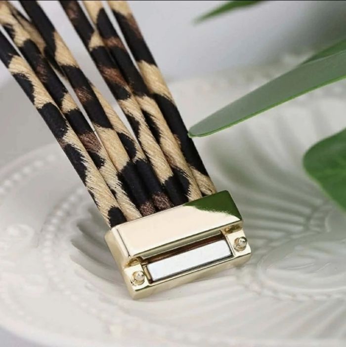 Magnifique bracelet multi-tour au motif léopard, parfait pour donner du caractère à n’importe quelle tenue. Les fines lanières souples s’enroulent élégamment autour du poignet, avec de superbes détails dorés ✨