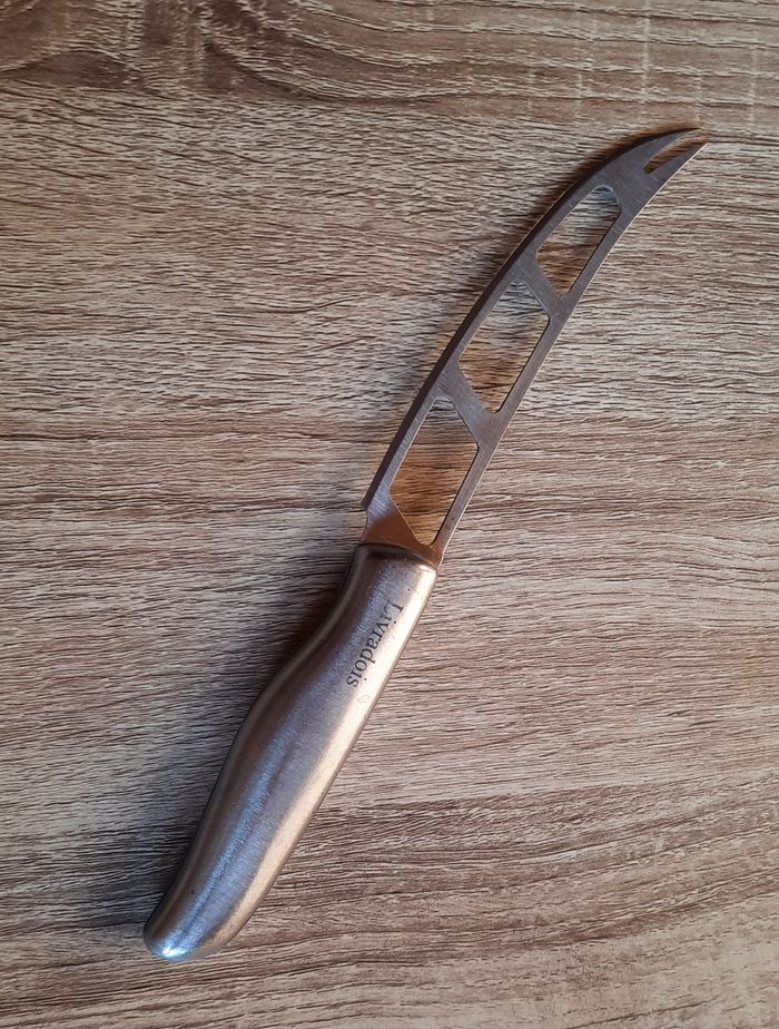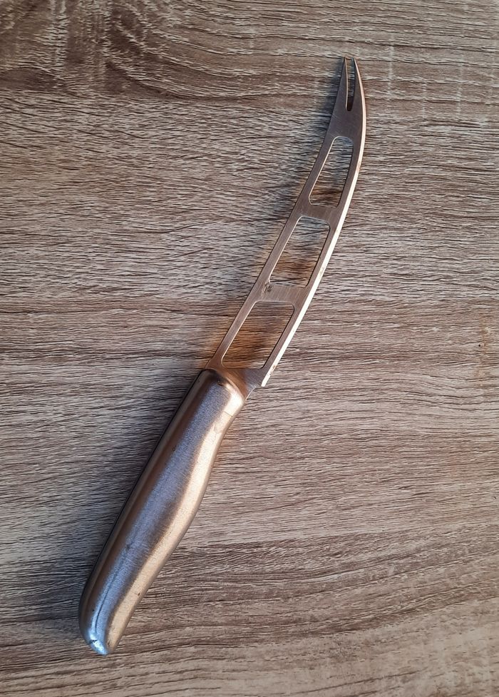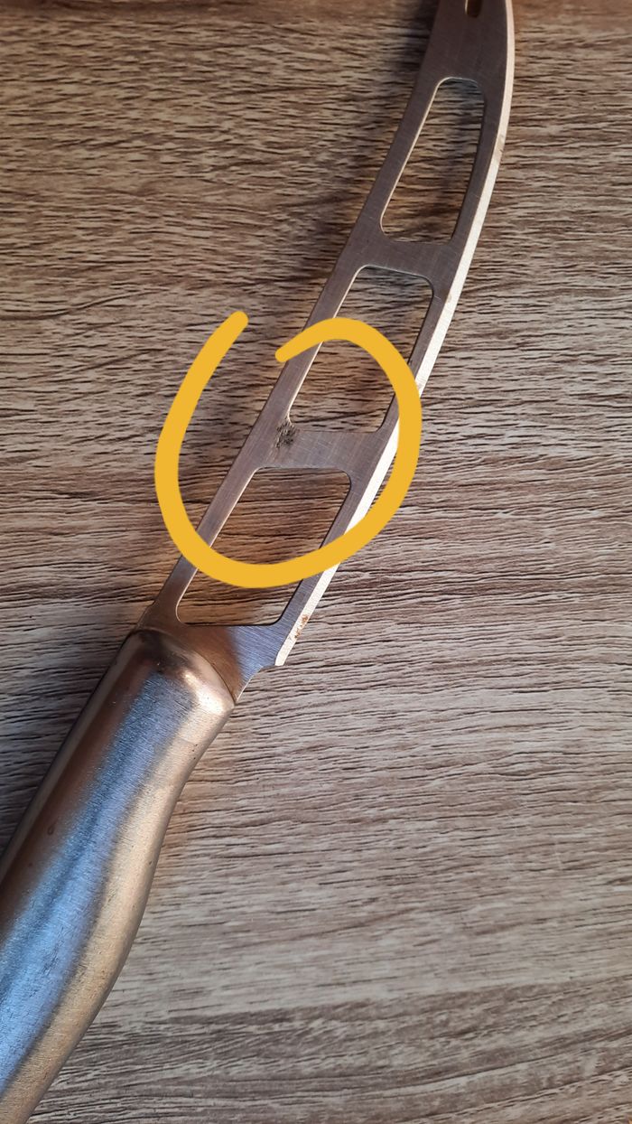 Je vends ce couteau à fromage en acier inoxydable. - Type de produit : Couteau à fromage - Matière : Acier inoxydable - Finition : Argentée Bon état, un défaut sur la lame identifié photo 3