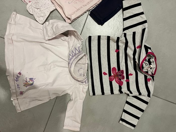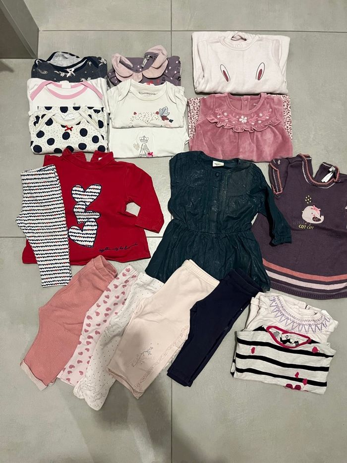 Lot 9 mois comprend : 6 bodies manches longues 2 pyjamas velours 2 robes 5 pantalons / leggins 1 ensemble legging / blouse 2 hauts : 1 ML et une robe/blouse Différentes marques : tao, sergent major, catimini, petit béguin, tex, vertbaudet …